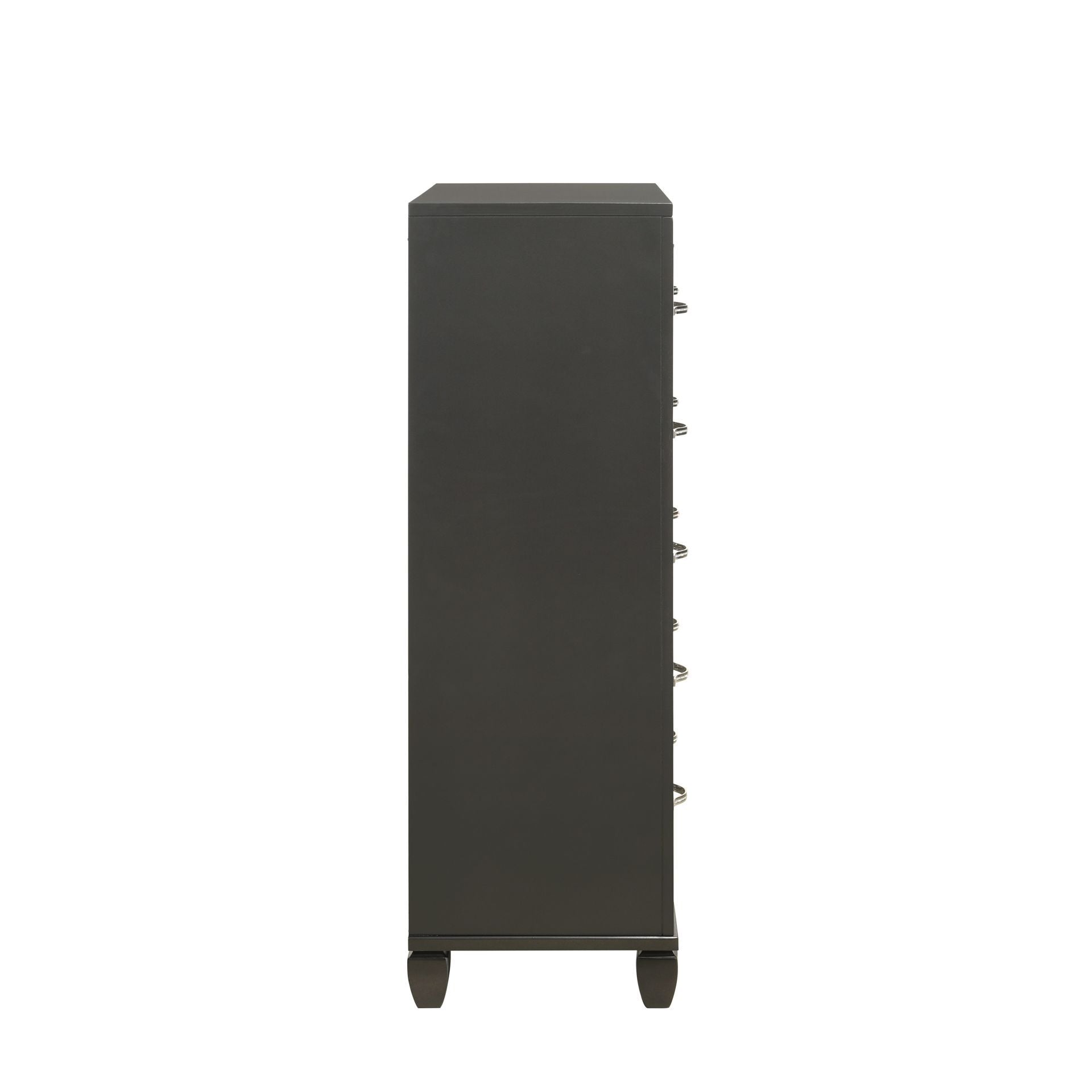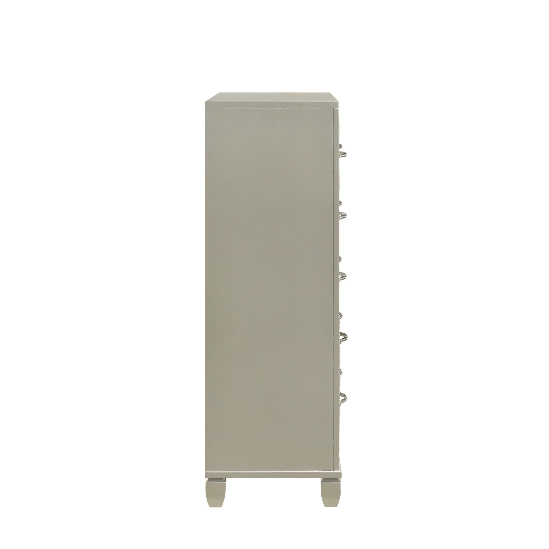 The Radiance Bedroom Collection is a mesmerizing blend of modern elegance and glamorous charm. Crafted with solid wood and MDF, this collection ensures durability and stability. The striking silver finish adds a touch of sophistication to each piece. The headboard, made of 80% faux leather and 10% cotton, creates a luxurious focal point in the room. The brushed steel face framing and glittered drawer fronts add a dazzling allure. The chrome pulls with rhinestone inlays exude opulence and style. The felt-lined top drawers provide a soft surface for delicate items, while the finished drawer interiors showcase meticulous attention to detail. The English dovetail construction and full extension ball-bearing glides ensure smooth and reliable operation. The crystal tufted, lighted headboard and mirror add a radiant ambiance to your space. With the Radiance Bedroom Collection, elevate your bedroom to new heights of elegance and glamour.