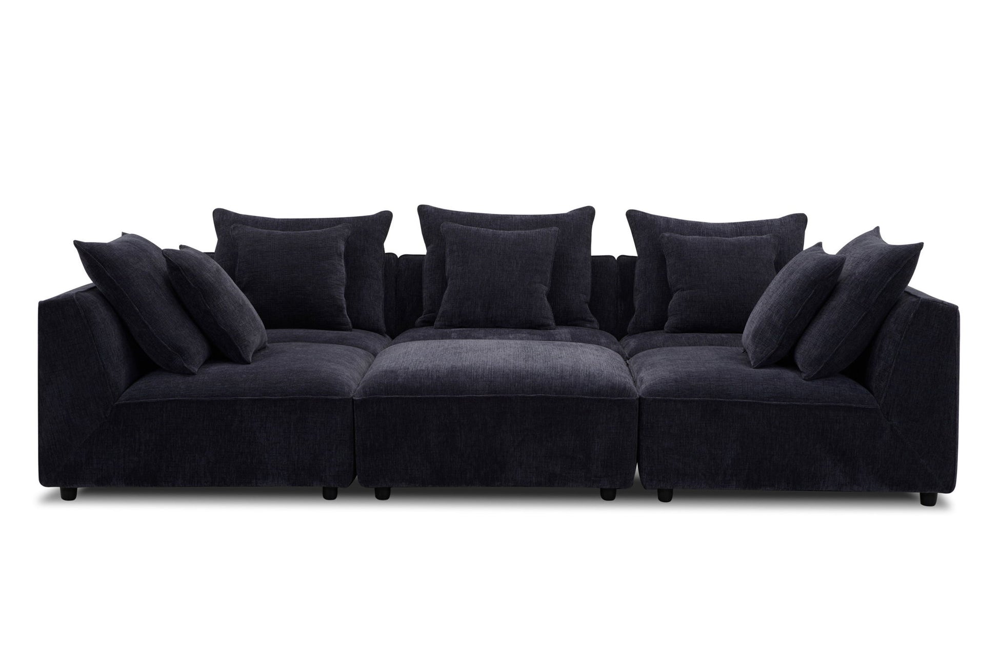 This exquisite sectional is tailored with precision and upholstered in a durable, 100-percent woven chenille fabric that boasts a velvety hand and and embossed pattern that adds and extra touch of sophistication. This sectional is designed with your ultimate comfort in mind. The comfort cushion is encased in cotton, down-proof channeled ticking to help it keep its shape and prevent feather migration. The cushions are padded with high-density Dacron and topped with sterilized down and feathers for maximum plushness. The sectional is built to last, with wood frames that feature reinforced corner blocks for lasting strength and stability. Select woods are kiln-dried to minimize warping and splitting while ensuring longevity. This attention to detail ensures that your sectional will remain sturdy and reliable. Whether you're looking for a cozy corner for movie night or a space to entertain guests, our 5-piece modular sectional has you covered. with its modular design, you can arrange the pieces to fit your space and your needs.
