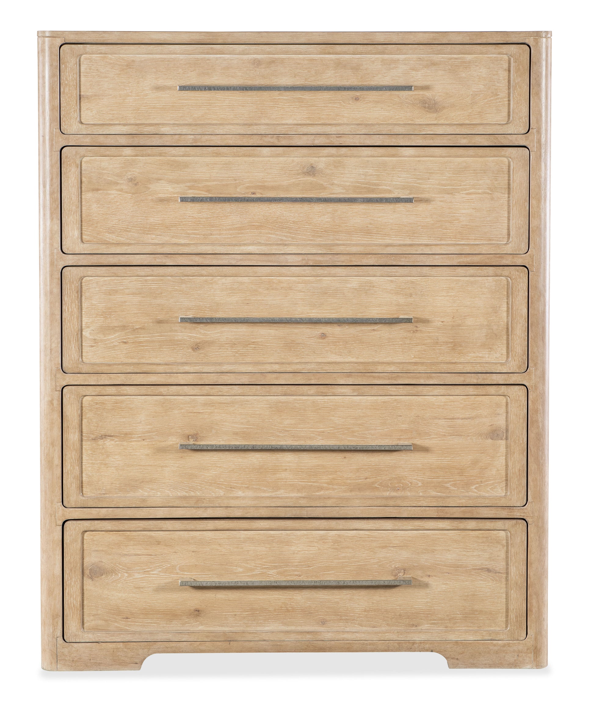 The Retreat Chest has a tranquil personality with a modern twist and organic, textured pewter bar pulls. Crafted of Oak and Maple Veneers, it is finished in the sand-colored Dune, transparent by design to showcase the unique grain patterns of the veneer. With five self-closing drawers, the top drawer has a removable felt liner, and the bottom drawer is cedar-lined. The chest is elevated on shaped block feet.