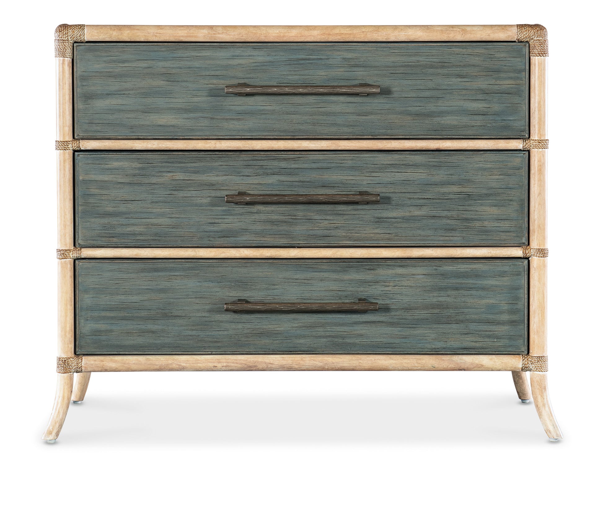 Inspired by tropical getaways, the two-tone Retreat Pole Rattan chest is a mixture of natural materials in a laid-back, versatile design. Accented by textured bar pulls in a soft pewter color. The chest is crafted of Bamboo and Maple Veneers with Rope accents. Three self-closing drawers