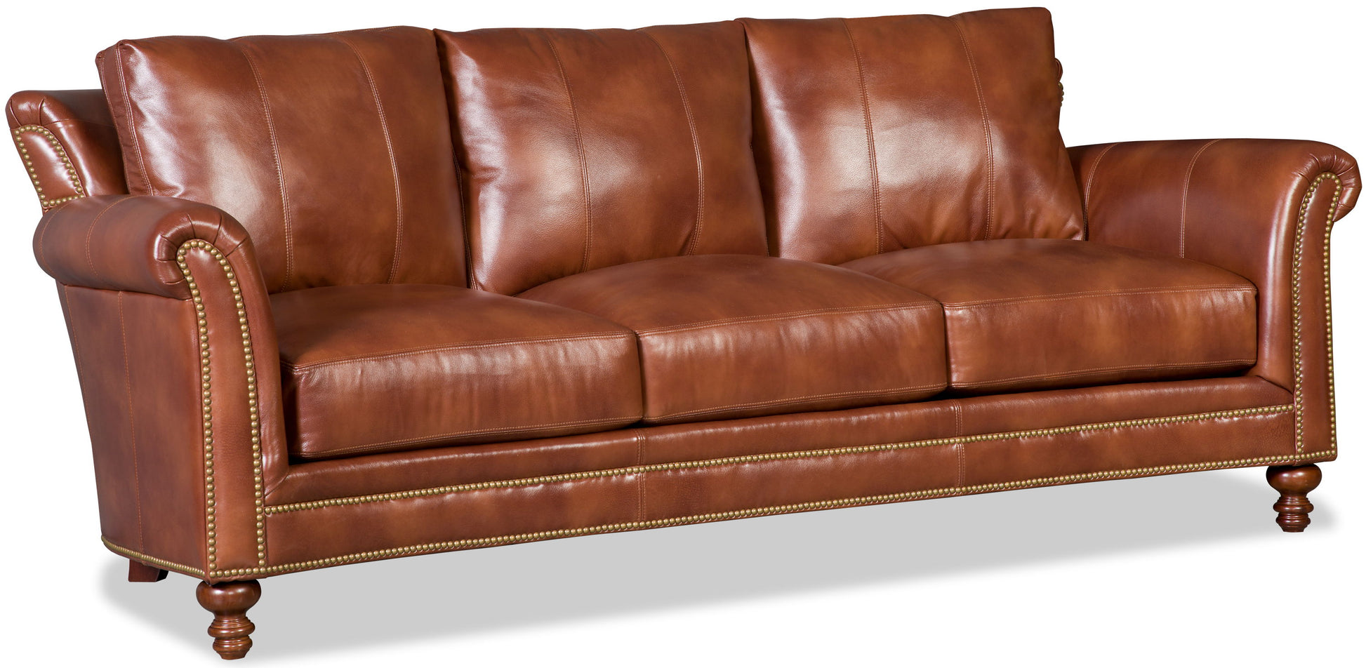 The Richardson Stationary Sofa 8-Way Tie is offered in hundreds of leather options and includes a standard nailhead trim #9 in natural finish. Other decorative nailhead finishes are available. Comes with a standard mahogany finish but other finishes are available. It features a loose back and a spring down seat.
