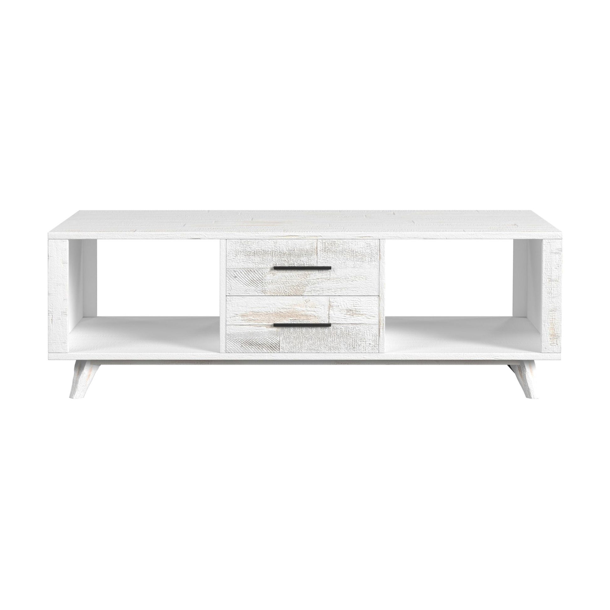The Rogen Rustic Coffee Table brings a perfect blend of vintage charm and modern functionality to your living space. Featuring a rustic white finish, it adds a timeless touch that complements a variety of decor styles. Crafted with a sturdy wood frame and acacia veneer, it showcases a beautiful natural grain finish. The two spacious drawers, constructed with English dovetail joints and ball-bearing glides, offer smooth and durable operation for convenient storage. An open shelf provides ample space for displaying decor or storing books, while sleek metal handles and angled legs lend a modern rustic aesthetic that enhances any room.