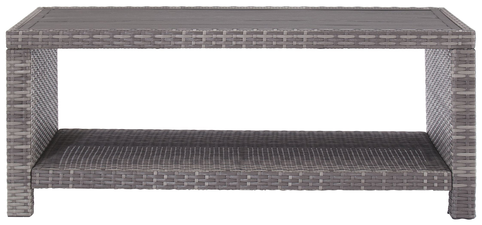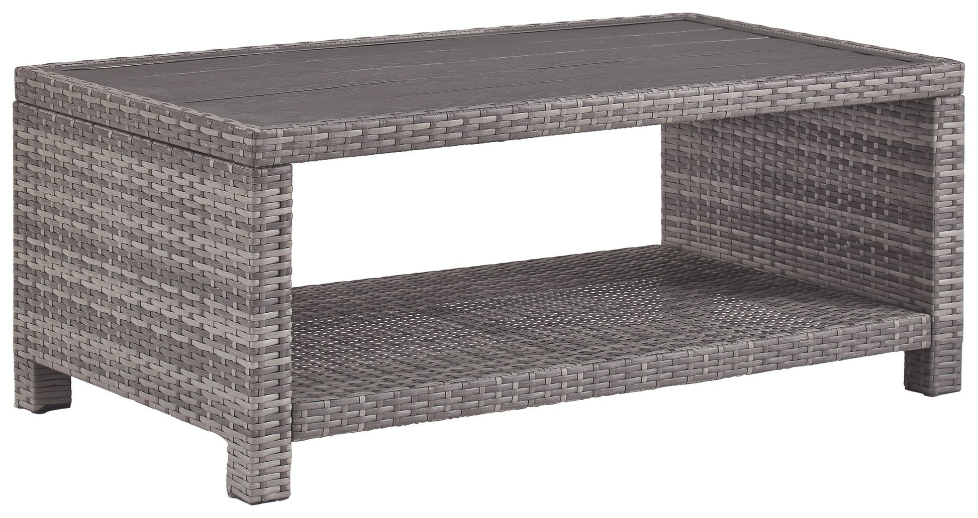Bring a coastal cool vibe to your outdoor living space with this coffee table. What looks like rattan is actually handwoven resin wicker in gray with all-weather protection. Rest assured, the planked wood-look top is water and stain resistant. Concealed aluminum frame is powder coated for seasons of carefree use.