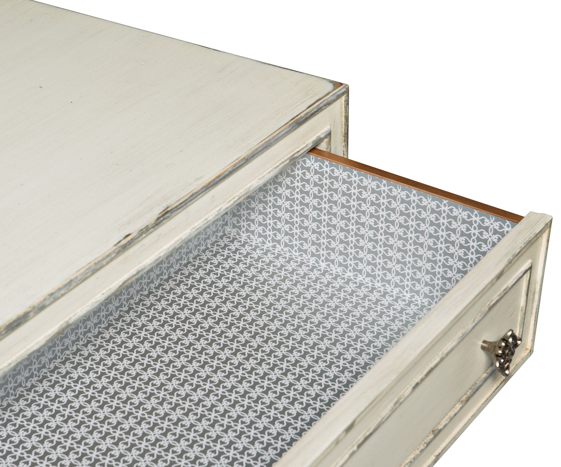- Top three drawers have gray and white wallpaper interior