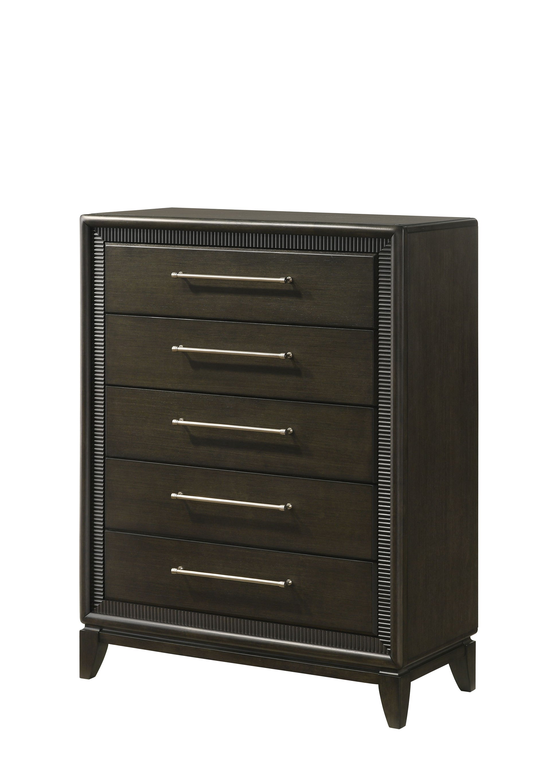 This contemporary bedroom set boasts a sophisticated aesthetic, characterized by its deep espresso finish that speaks to modern tastes. The clean-lined bed features an elegantly tufted headboard, offering both comfort and style, and is complemented by streamlined nightstands and a dresser with a sleek, matching mirror. The brushed metal hardware provides a subtle contrast, highlighting the set’s chic and urbane design.
