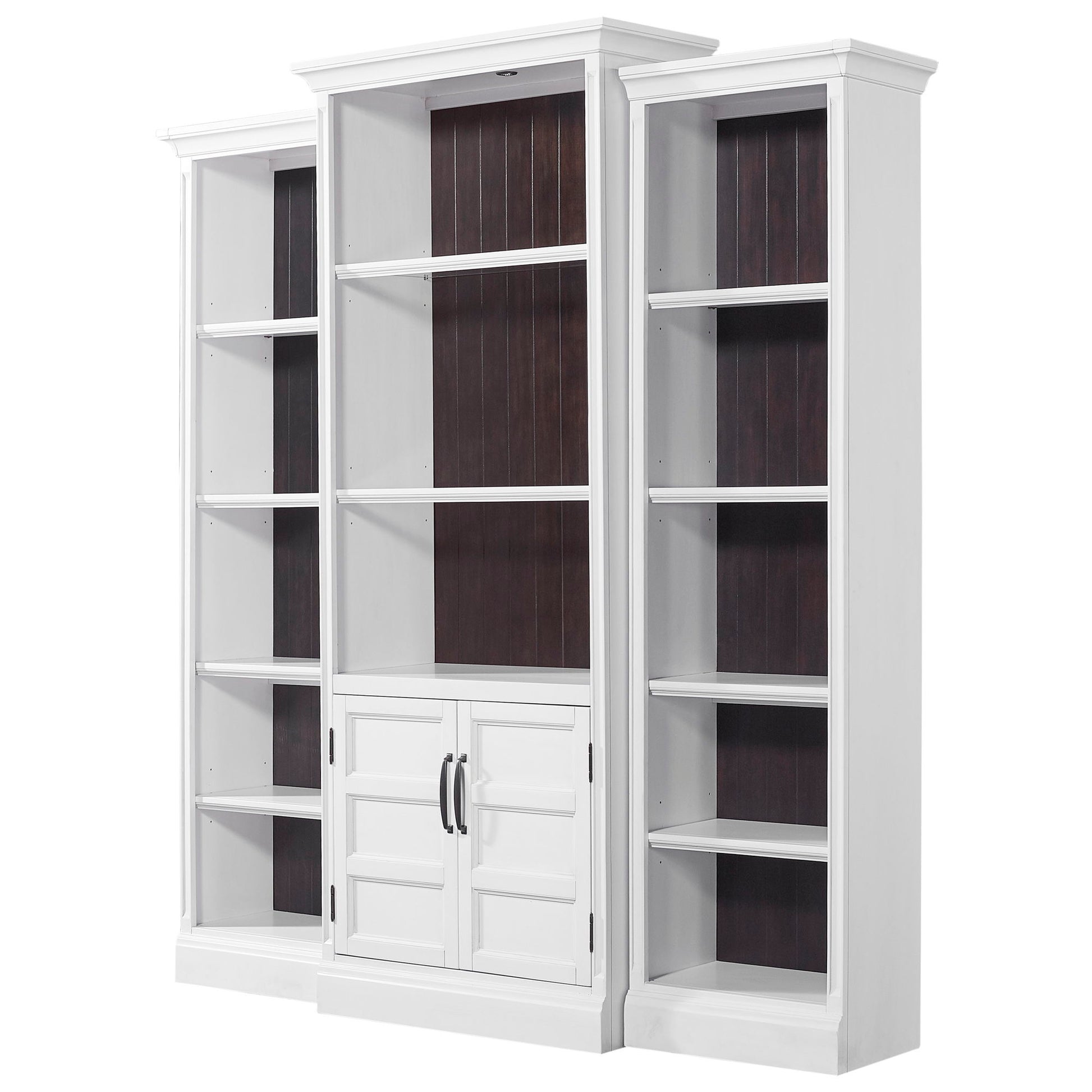 This spacesaver library wall is the perfect fit for small spaces that need classic library storage. The two side bookcases nestle up next to the taller and wider center doored bookcase. Adjustable shelves allow you the freedom to decorate as you please.