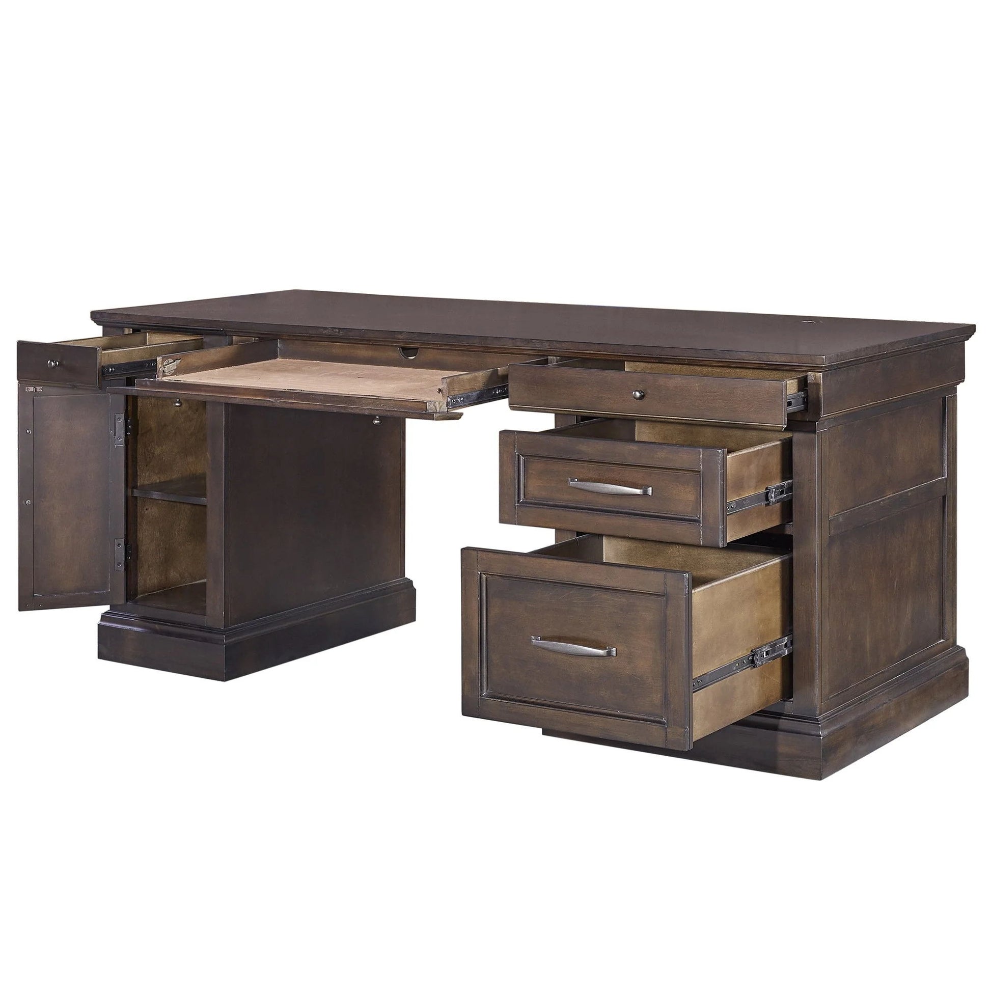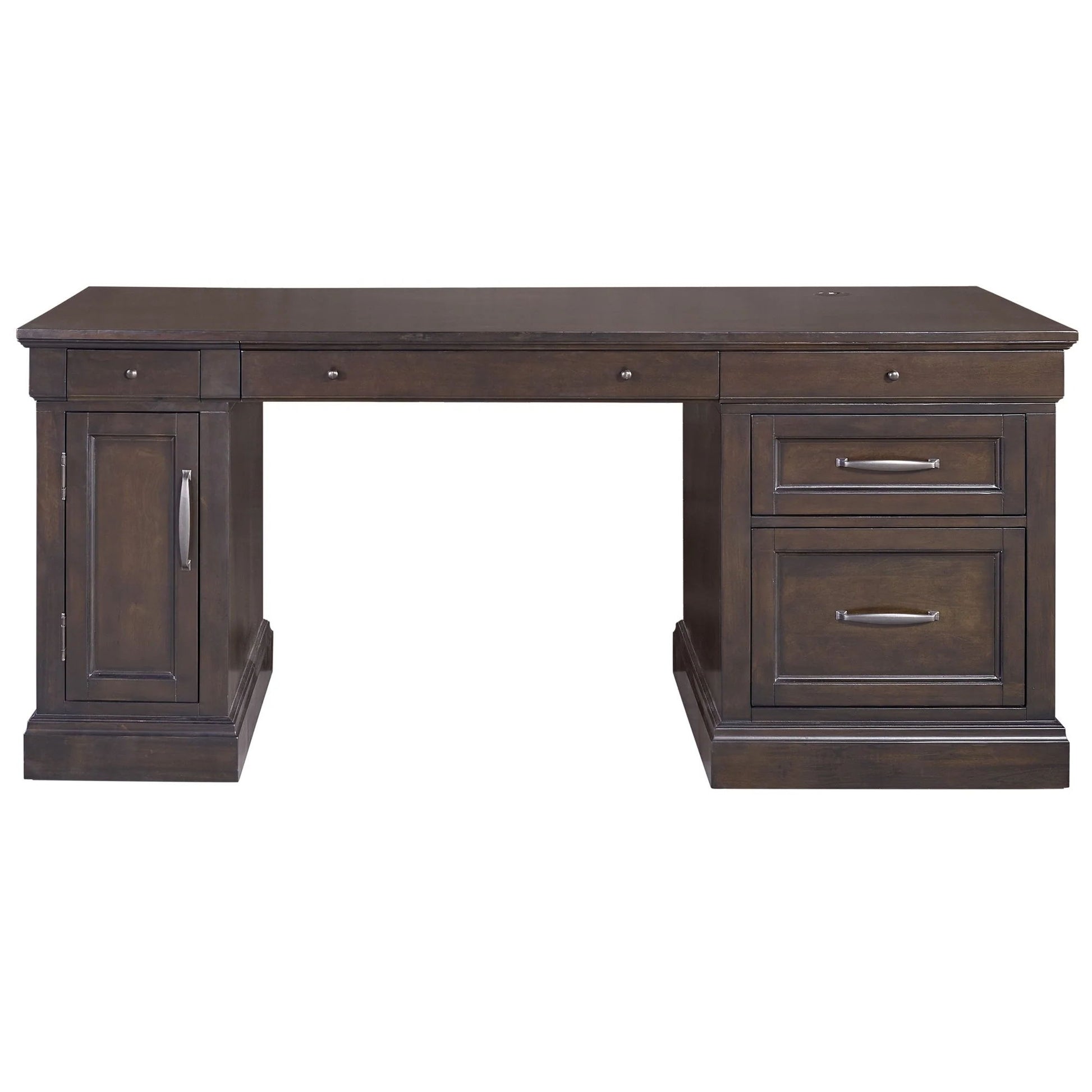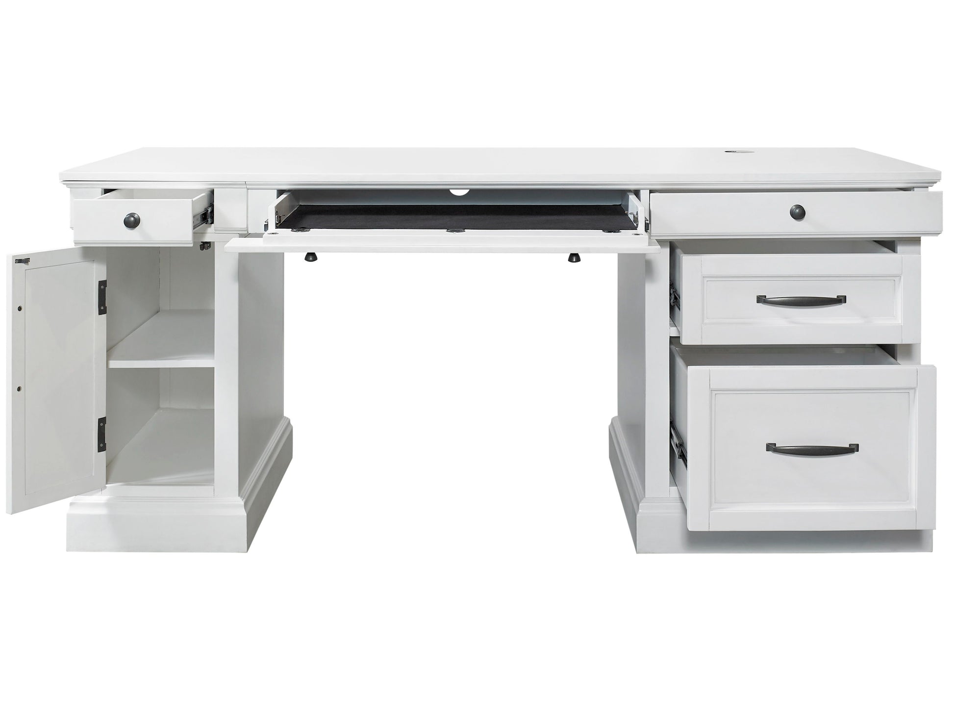 This classically refreshed pedestal desk is the perfect blend of timeless elegance and modern functionality. This stunning desk has been updated with traditional styling that complements today's homes, making it a perfect fit for any decor. This desk is simply stunning. The attention to detail is apparent in the custom-designed metal hardware in a timeless finish, which adds an extra touch of sophistication. This desk isn't just about looks. It's also designed to help you stay organized and productive. The drop-front keyboard drawer makes typing a breeze, while the integrated, dual USB/AC power center ensures that your devices are always charged and ready to go. With adjustable and removable shelves, you can customize your storage space to meet your needs. And the English dovetail drawer construction ensures durability, so you can enjoy your desk for years to come.
