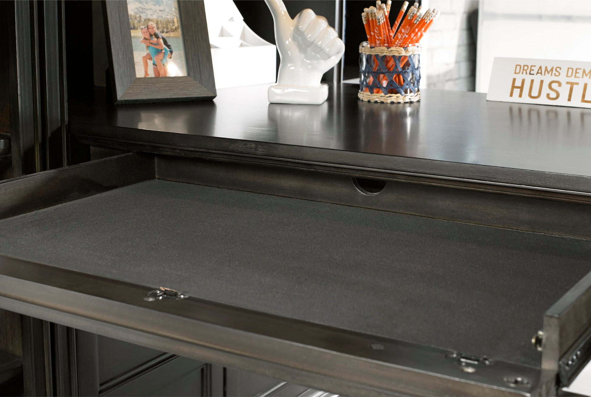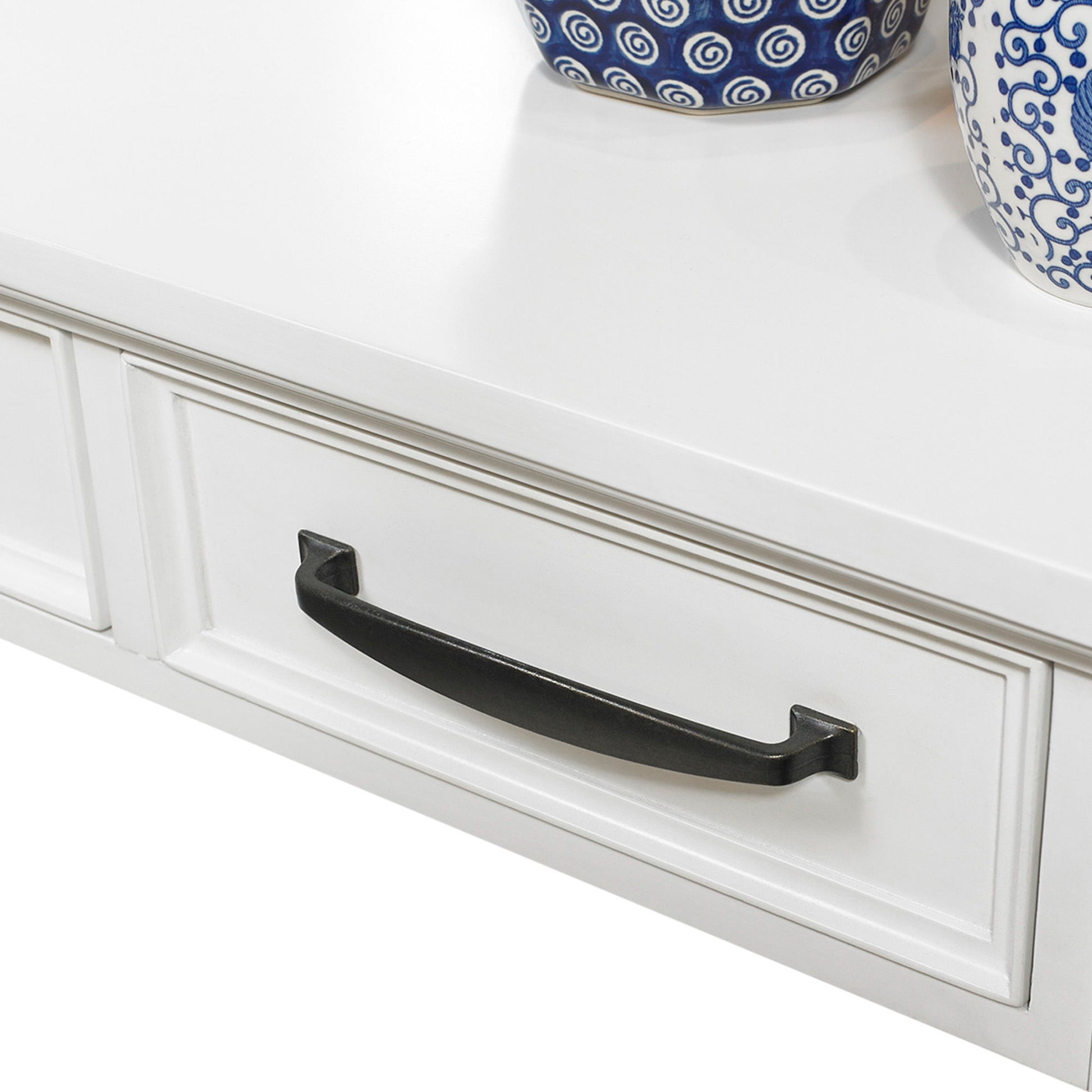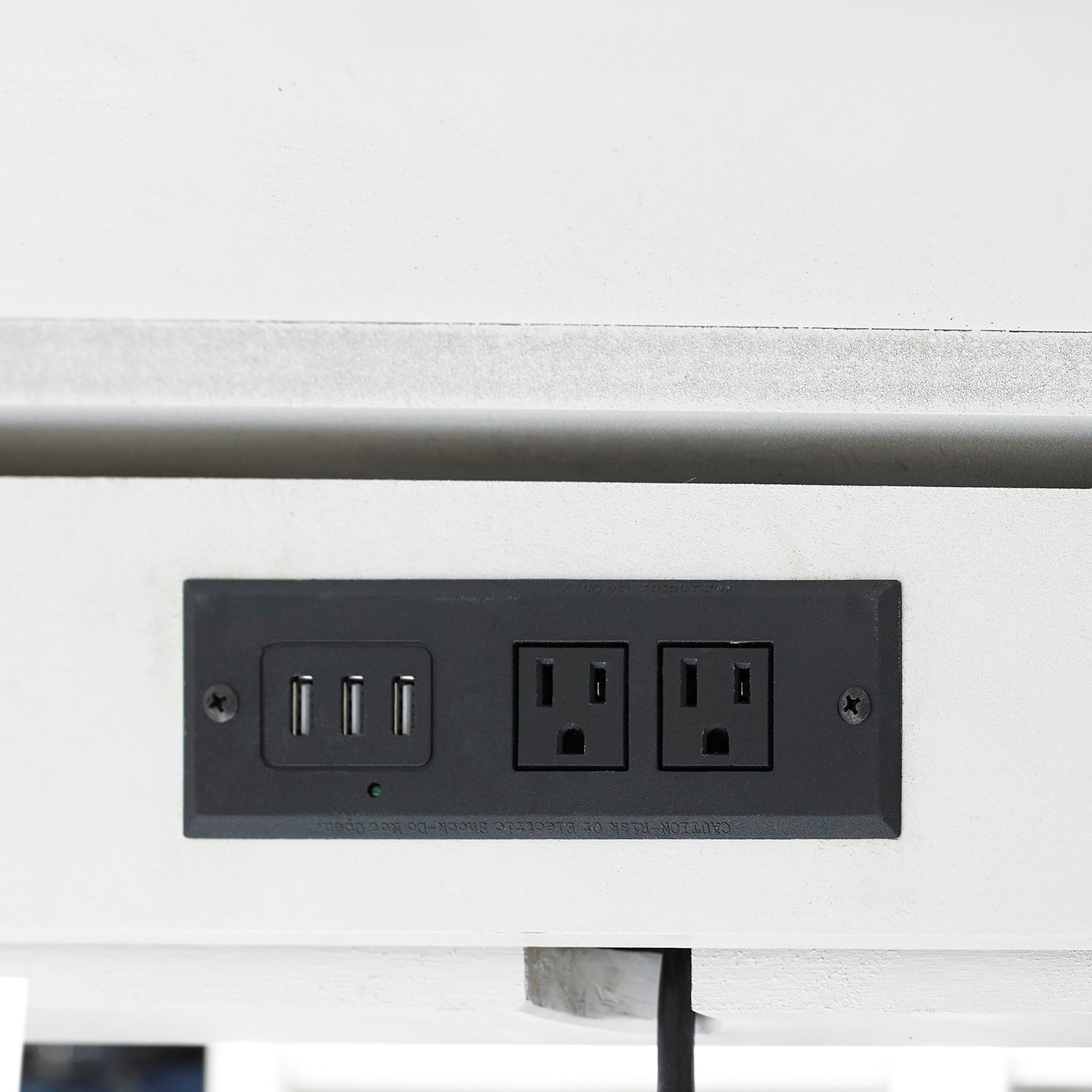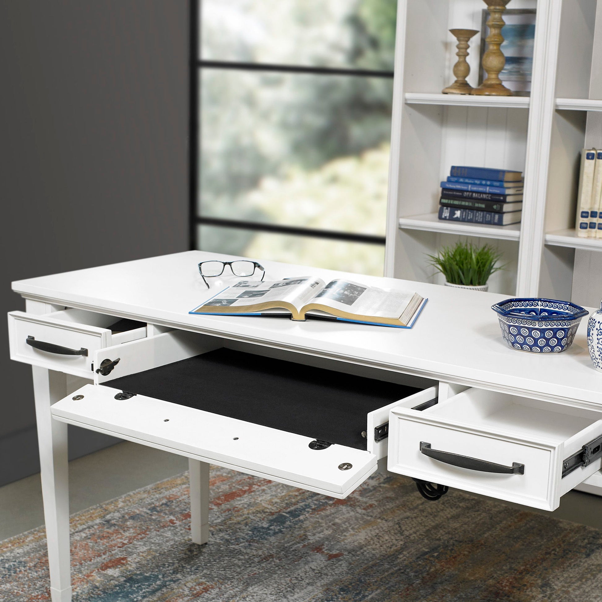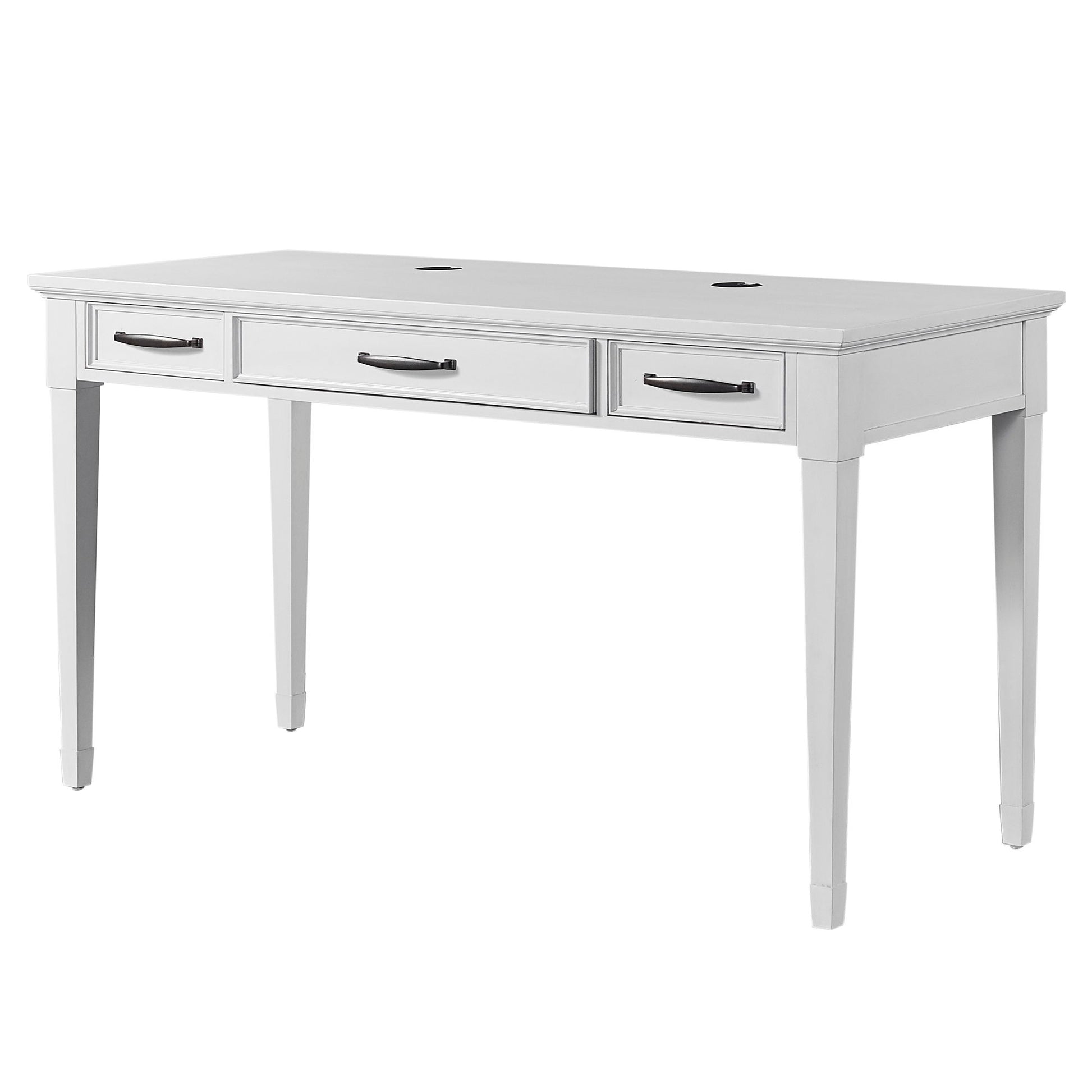 Transform your workspace with this sophisticated and functional writing desk. Finished in elegant white and accented with custom-designed metal hardware in a timeless Burnished Nickel finish, this desk adds a touch of style to any room. With a drop-front keyboard drawer, typing is effortless and convenient. The integrated Dual USB/AC Power Center makes it easy to keep all of your devices charged and ready to use. And, with English dovetail drawer construction, you can be confident in the durability of this desk for years to come. The desk features solid, tapered wood legs for both style and strength, and two storage drawers with ball-bearing drawer glides for smooth opening and closing. This desk is the perfect combination of form and function, offering ample storage space for all of your essential items.