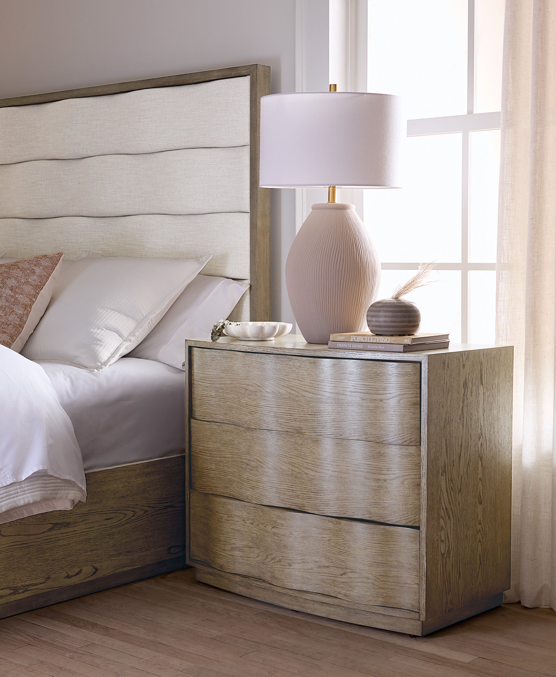 A stylistically versatile dresser blending natural textures with a light-and-airy modern aesthetic, the Sonnet bow-front Bachelors chest has 3 push-open drawers with shaped-wave drawer fronts. Crafted of Quartered and Cathedral-Cut White Oak Veneers, it has a light earthen-toned finish. The top drawer has a cream-colored removable drop-in left liner. The plinth base adds chic modern appeal.