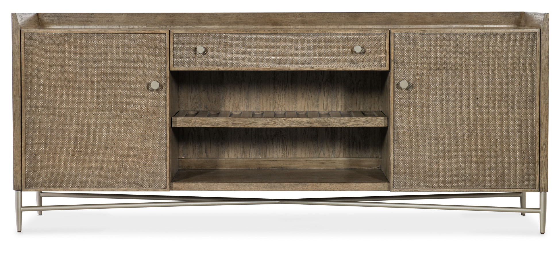 Mixing Quartered Oak in an earthen-toned finish with cane-front drawers, a metal base and stretcher and a marble-inset top, the Sonnet Credenza blends natural textures with a refined minimalist silhouette. The credenza features two doors with soft-close hinges and magnetic catches. Behind the left door is one adjustable wood shelf and one pull-out tray, and one adjustable wood shelf is behind the right door. The center section contains one drawer and one adjustable/reversible wood shelf with wine storage option that holds up to 9 bottles. A ventilated back panel with wire management behind both doors accommodates media. Complementing the marble inset top is a gallery back and side rail on top.