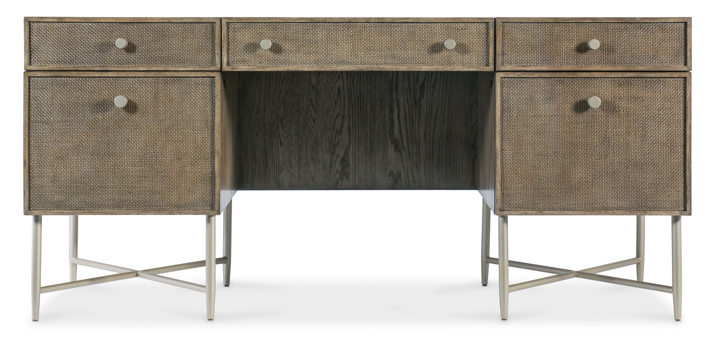 Mixing Quartered, Cathedral-Cut Oak in an earthen-toned finish with cane-front drawers and a metal base, stretchers and tapered legs, the Sonnet Executive Desk blends natural textures with a refined minimalist silhouette. The five drawers have cane-inset fronts, and there’s a removable/interchangeable writing surface and pencil tray that can be used in either the right or left top drawer. Each of the top side drawers has two removable partitions. The center drawer has a drop-front writing surface and wire management. Two locking file drawers have a Pendaflex letter/legal filing system.