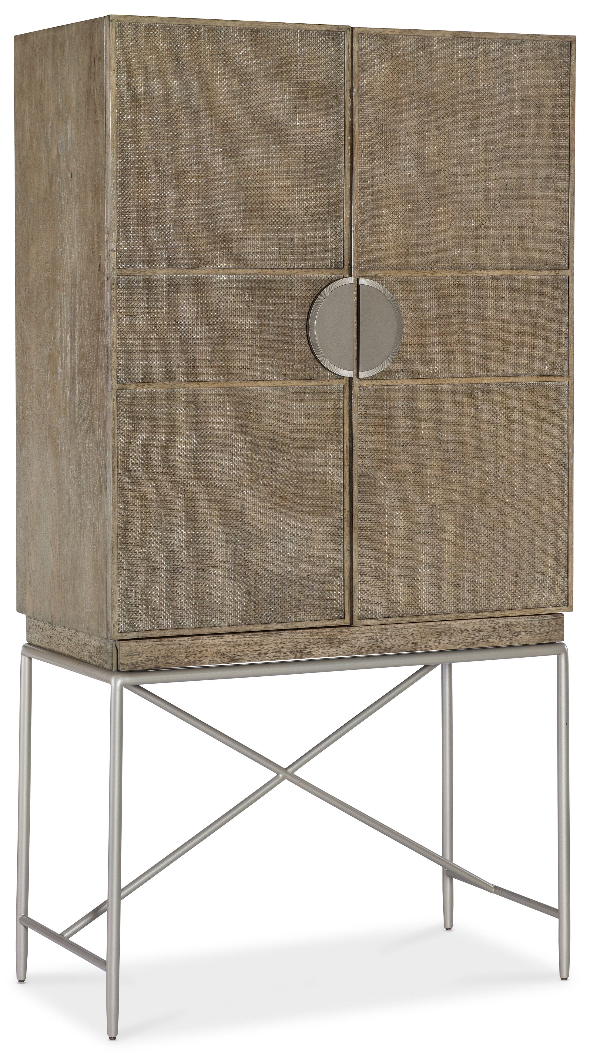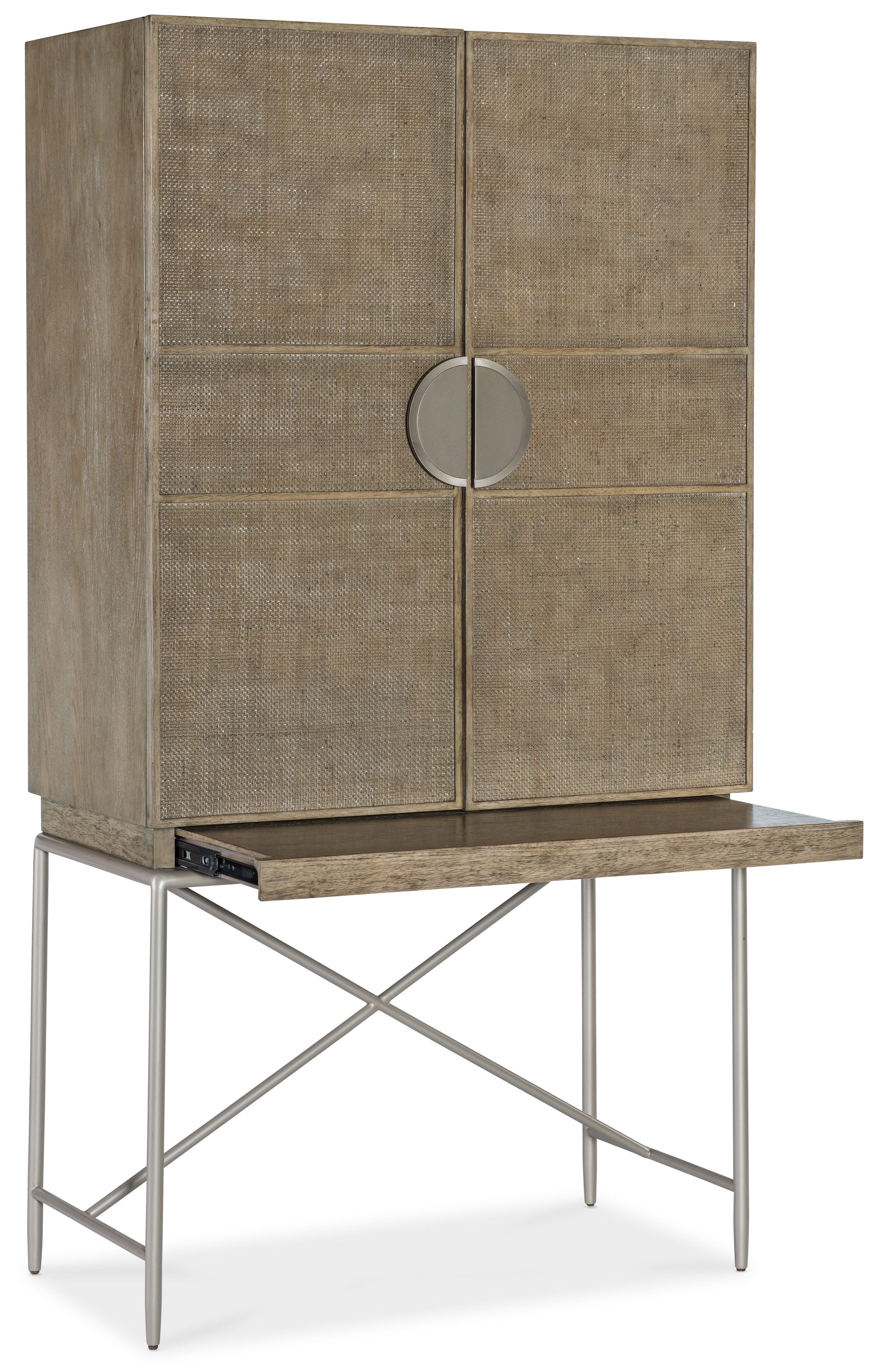 The Sonnet Hub offers a stylistically versatile, highly functional piece that blends natural textures with a refined minimalist silhouette. Crafted of Quartered and Cathedral-Cut White Oak Veneers in a light earthen finish with complementary woven cane door fronts, the Hub gets you organized and keeps clutter out of sight. Behind the two doors with soft-close hinges are an adjustable shelf in the top section; one fixed wood shelf; four small vertical storage cubbies with two removable partitions on magic wire; one adjustable wood shelf in the center section, two small drawers and a metal base with slender tapered legs and a stretcher. A circle-shaped pull and round knobs on the inside in a champagne finish enhance the chic vibe. Measures 40 inches wide by 20 inches deep.