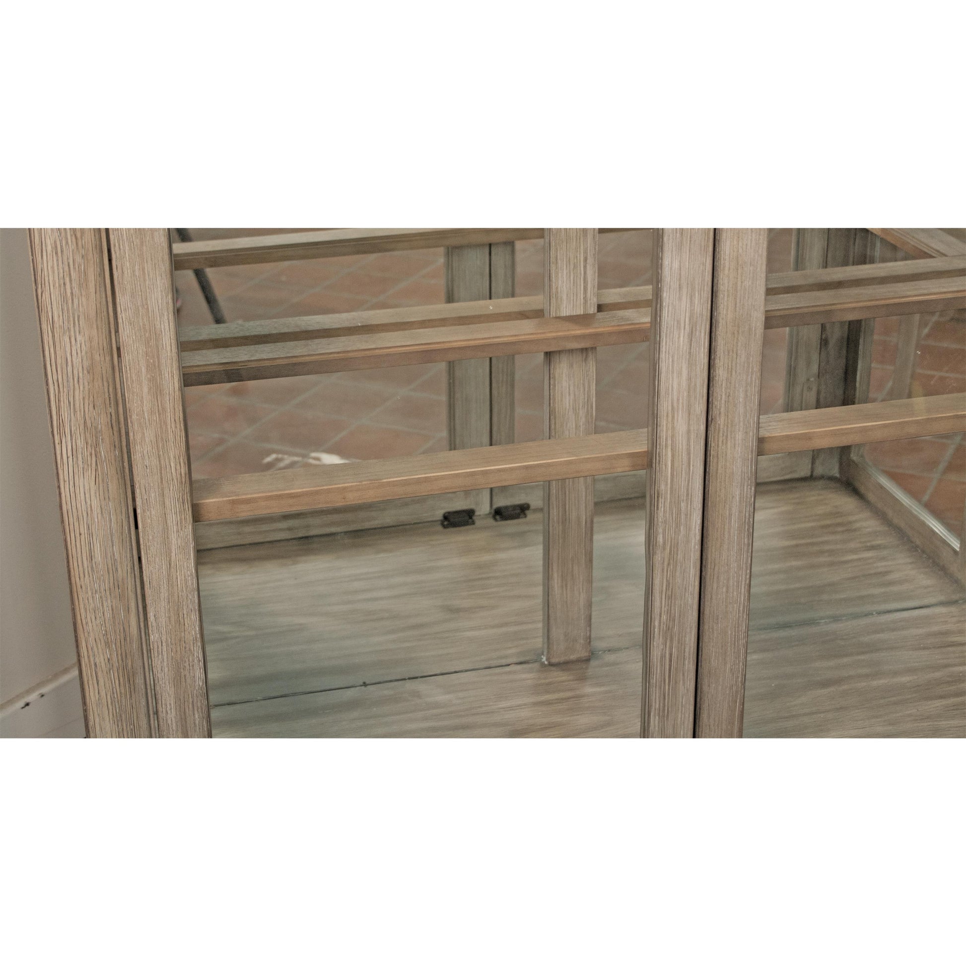 - Wood-framed glass doors reveal three adjustable and one fixed wood-framed glass shelves