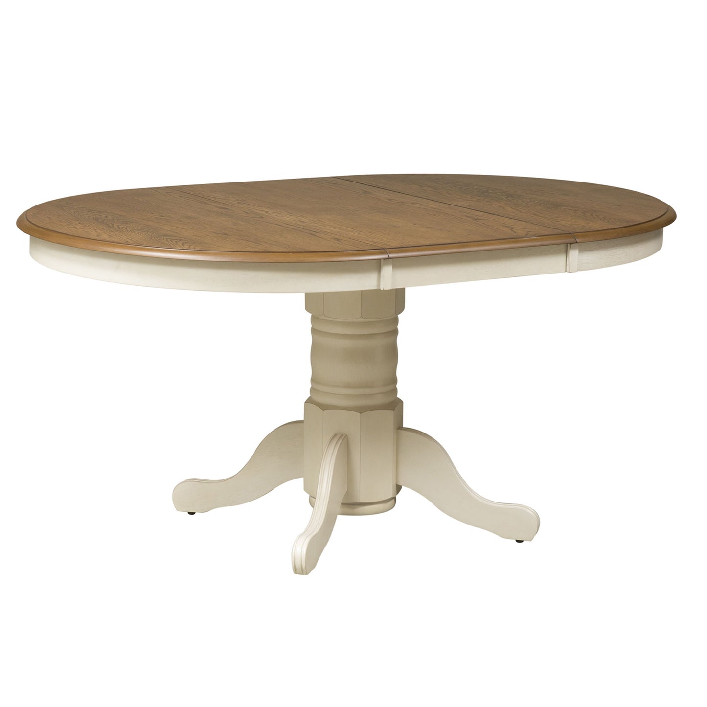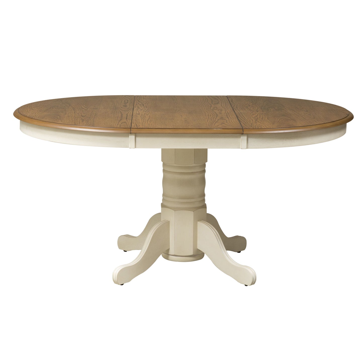 Wow family and friends with the Springfield pedestal table set. Crafted of poplar and rubberwood solids with white oak veneers, this set features a cream finish on the base with a honey top and consists of the pedestal table and four ladder back side chairs. This table has a metal geared track system making for easy opening to insert the included 18” removable leaf and is anchored by a heavy turned pedestal flowing into splayed feet for a nice design appeal. The ladder back side chairs have a wood seat with heavy turned legs and nylon chair glides to protect your flooring. The Springfield collection is appealing as it evokes nostalgia for earlier times.