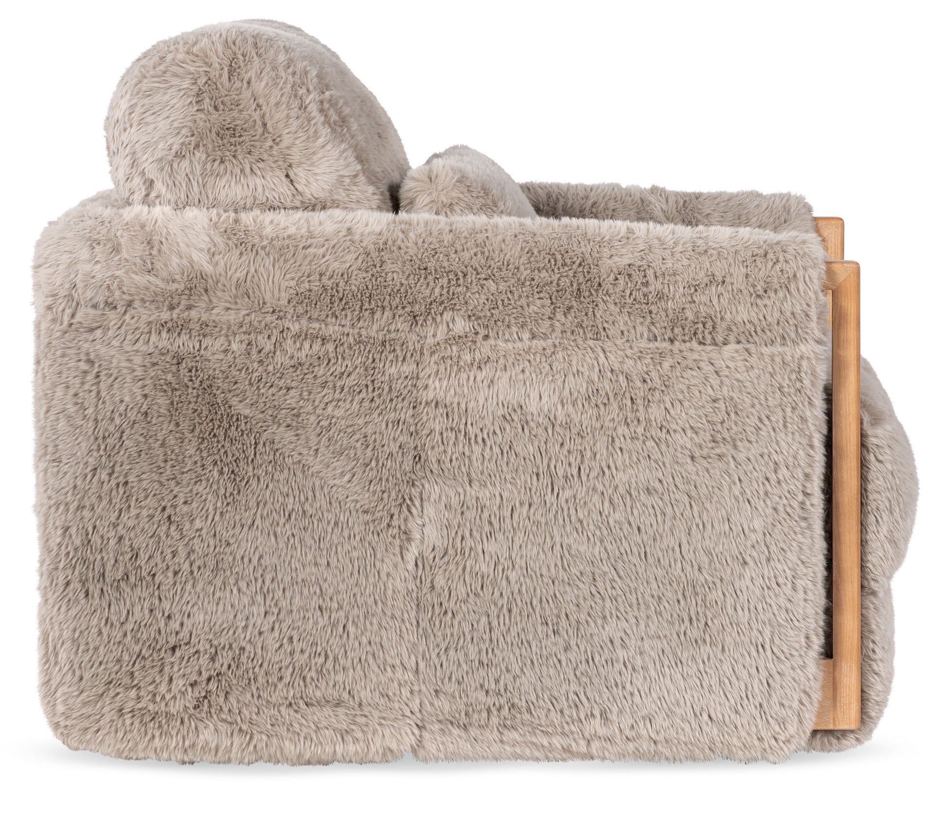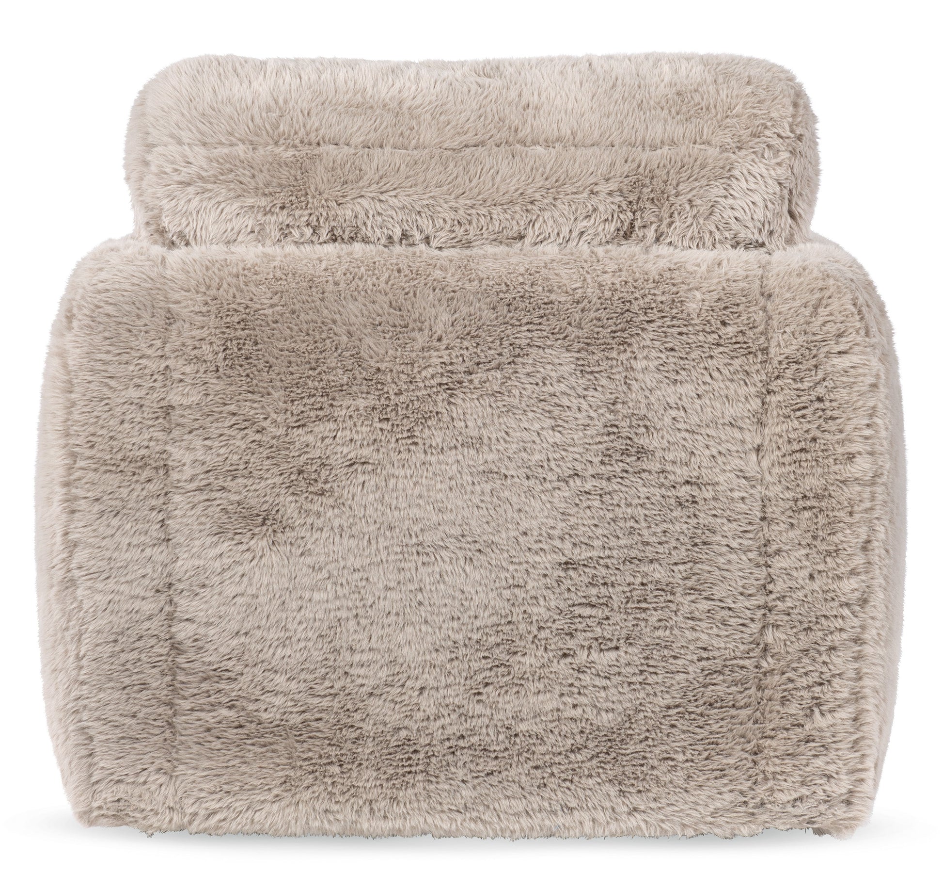 In a light and airy modern style, the Meridian Swivel Chair has exposed wood trim on the arm fronts and is covered in the soft-colored accented by designer topstitch trim and a comfortable kidney pillow.