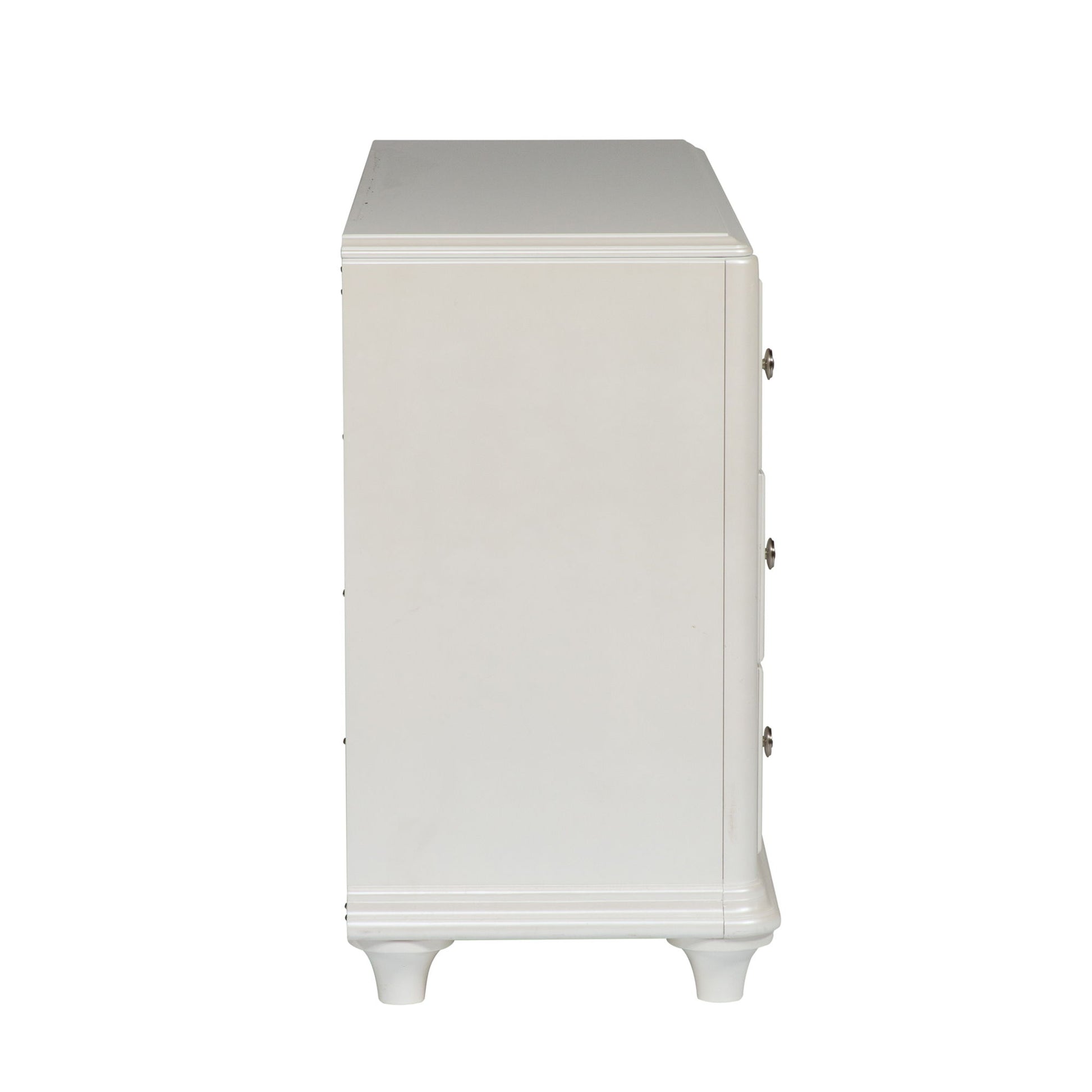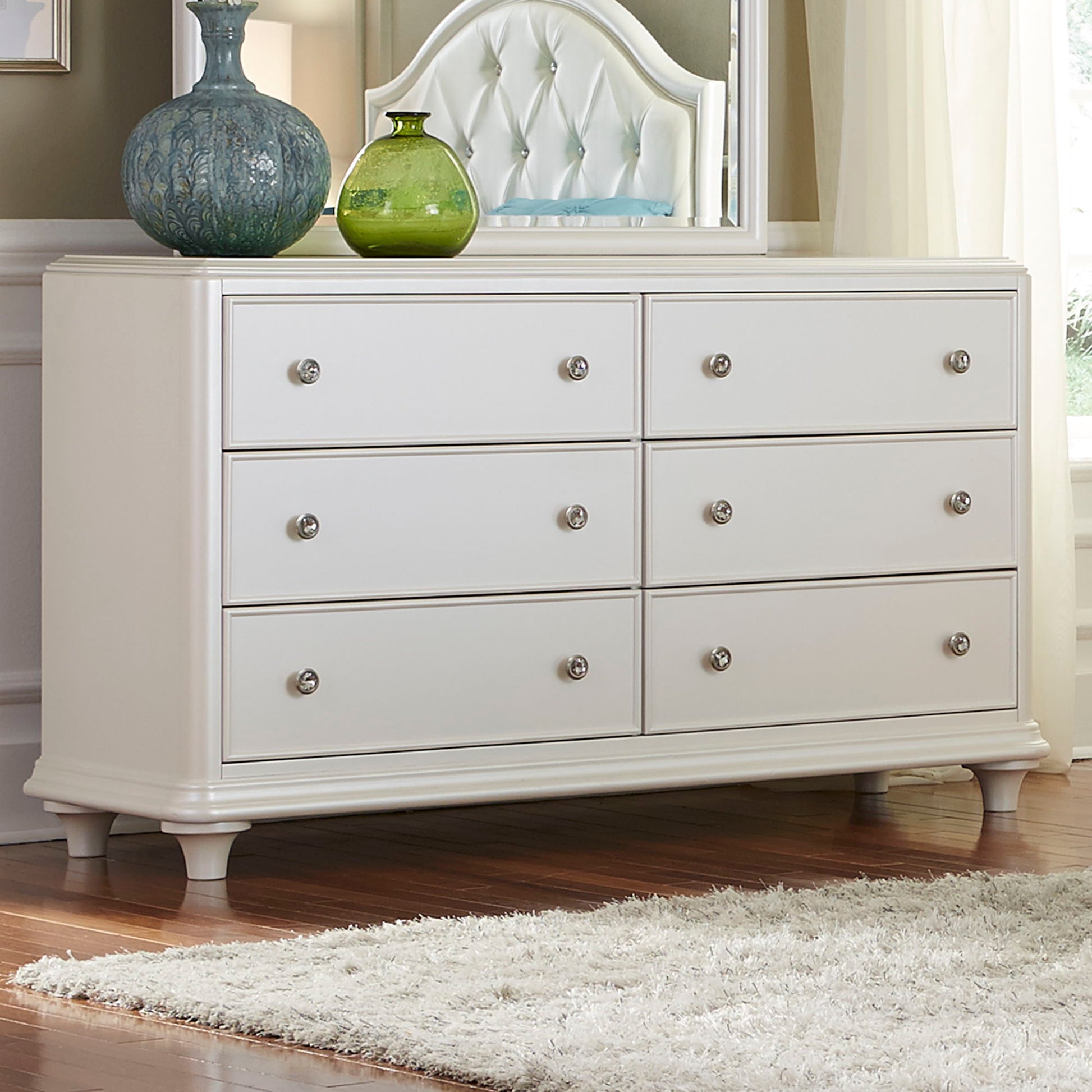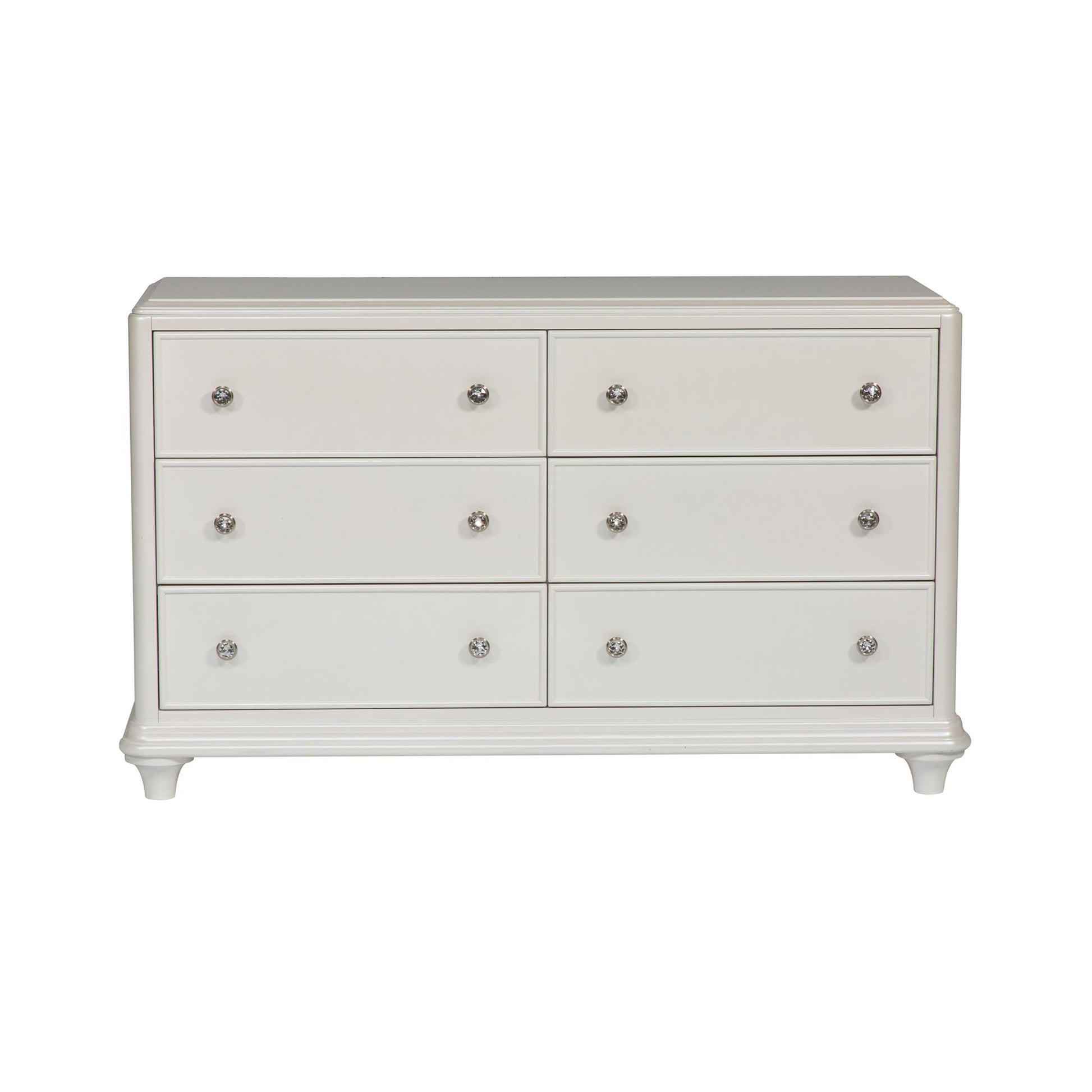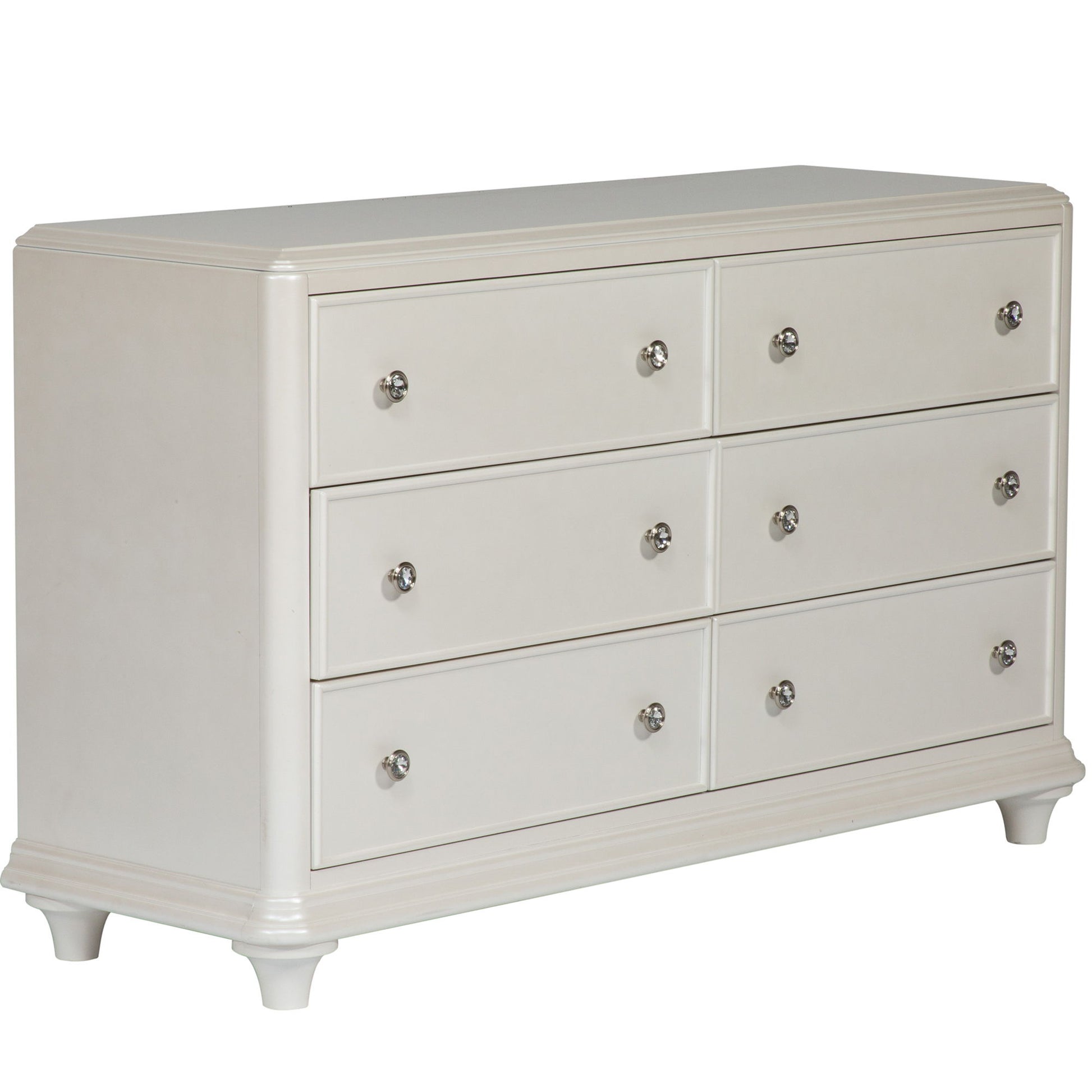 Accent your room with the Stardust 6 drawer dresser. Crafted with poplar rubberwood, cashew solids, and MDF, this piece features an iridescent white finish, bead molding on each drawer front, softly rounded corners, full extension drawer glides for easy access to storage, bottom case dust proofing, top drawers lined with black felt, step molding, fully stained interior drawers, anchored by bun feet, and is accented by crystal knob hardware.