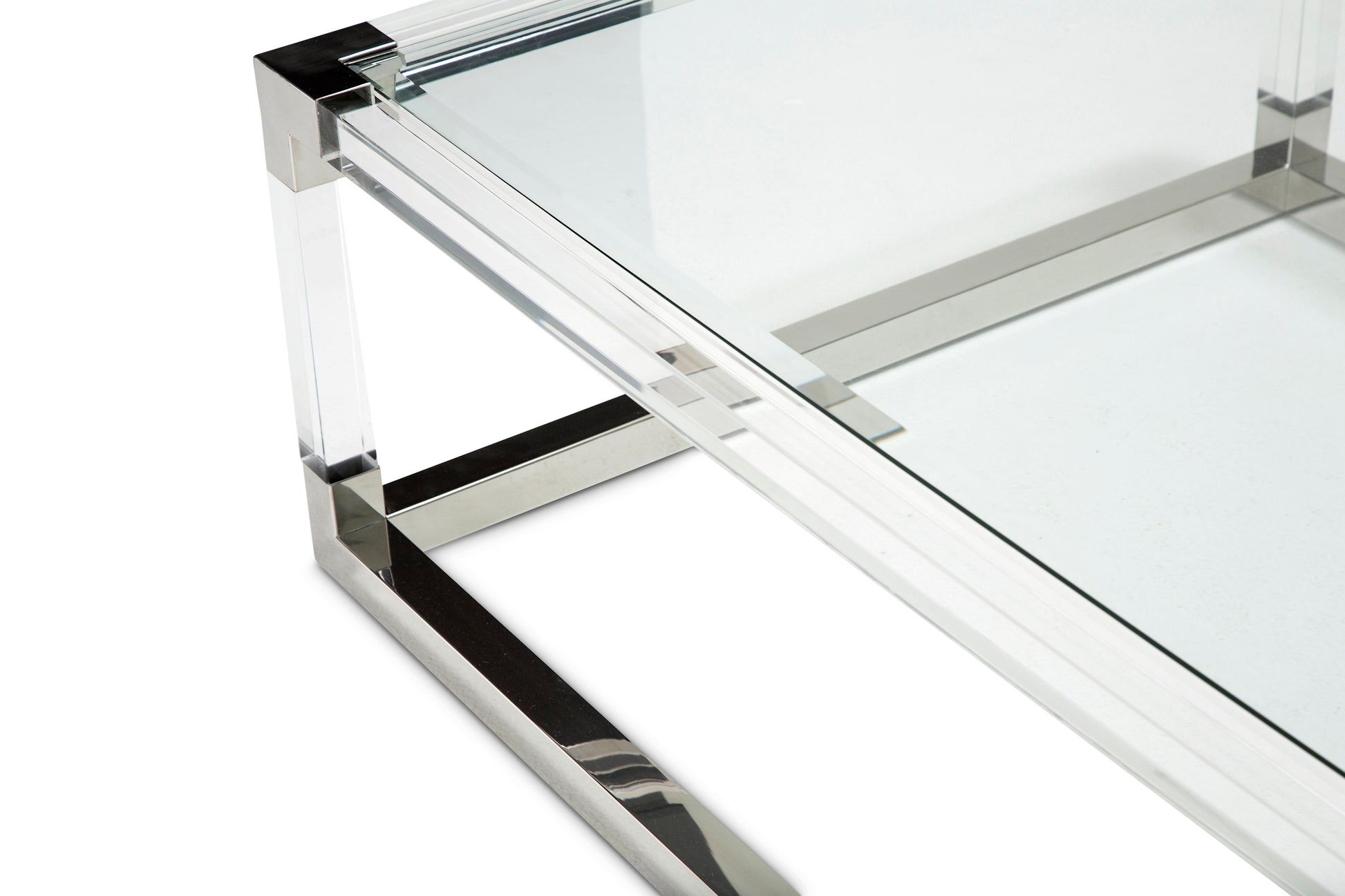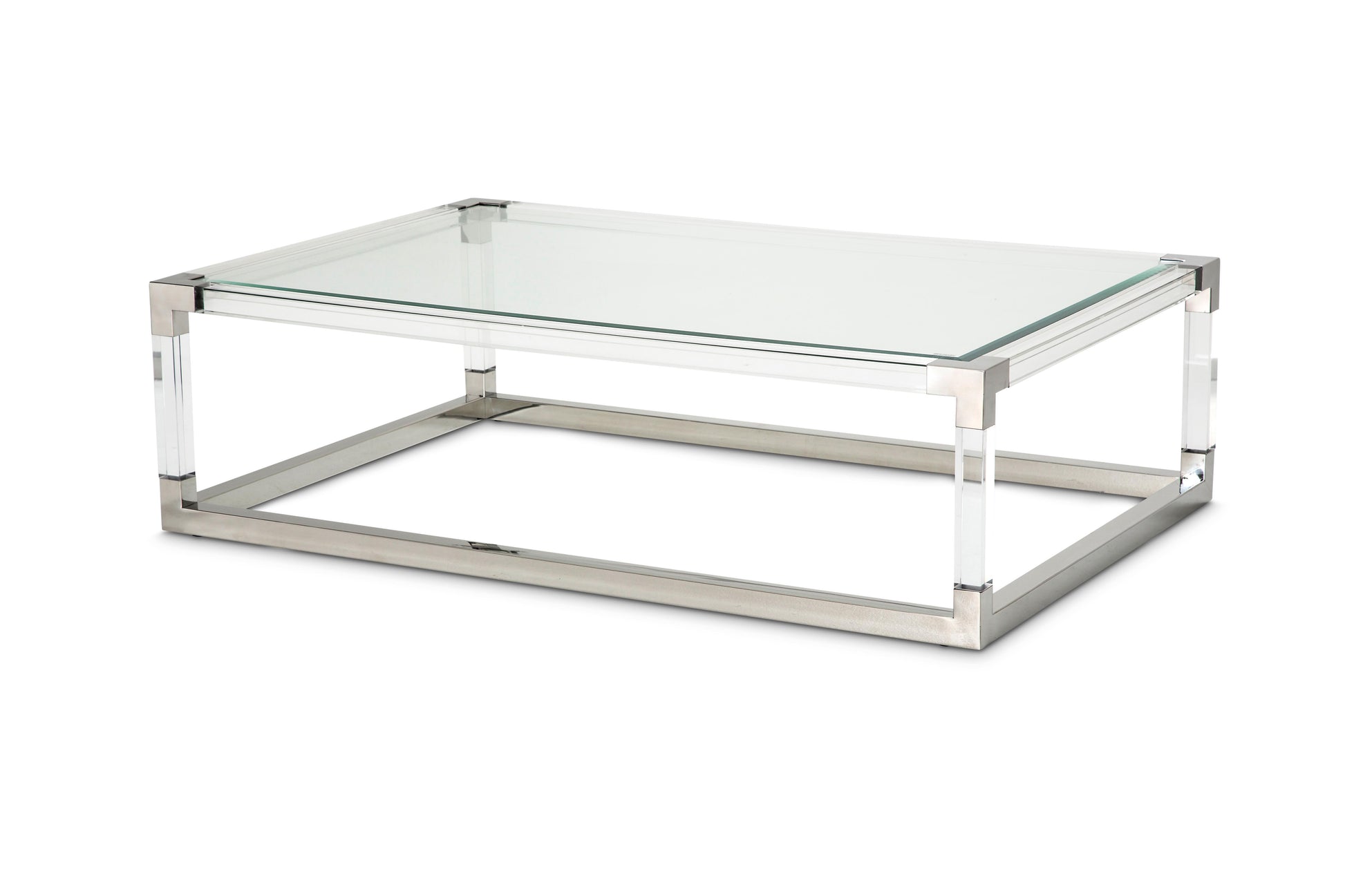 Brighten your living room instantly with the State St. Cocktail Table. Glass, gleaming acrylic and stainless steel bring a soft glow guaranteed to meld with your home style. Acrylic trims and legs give this piece depth and sturdiness that creates a clean, lasting piece. Set your clear glass tabletop with your favorite centerpiece, and enjoy your stunning living room.