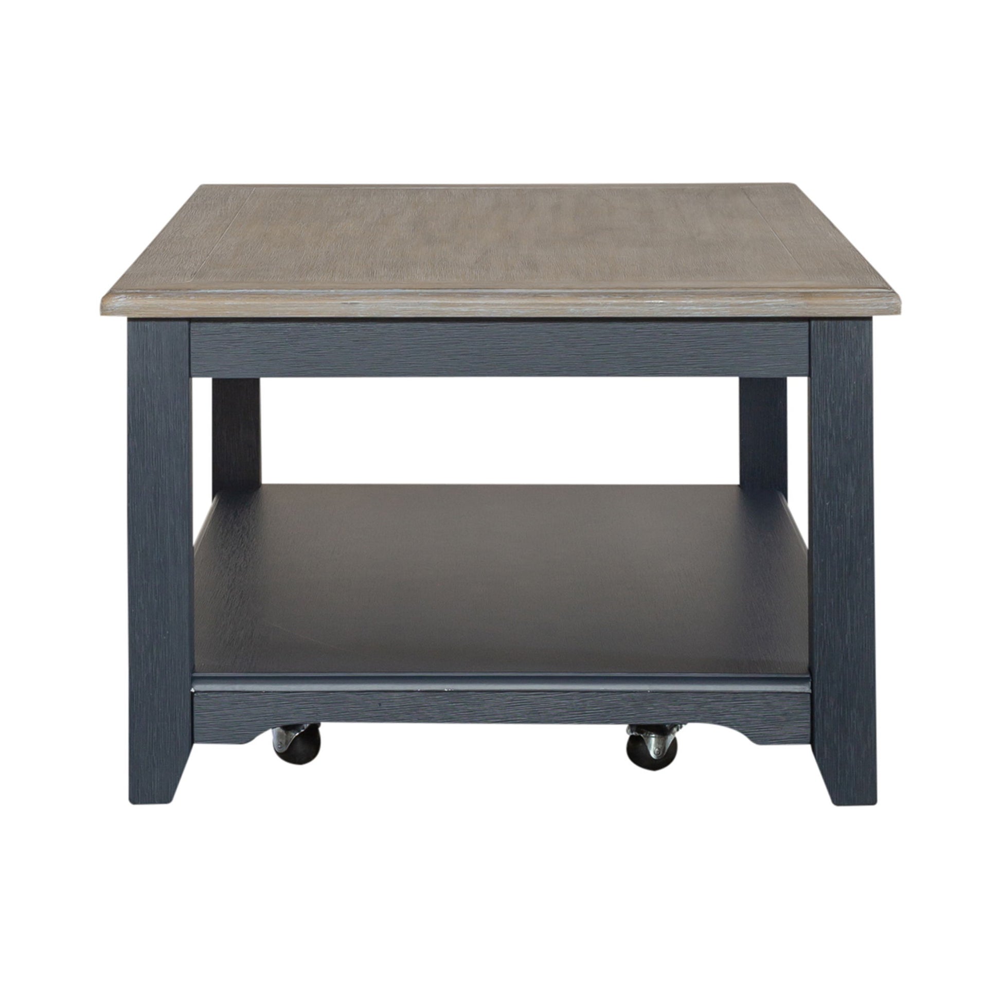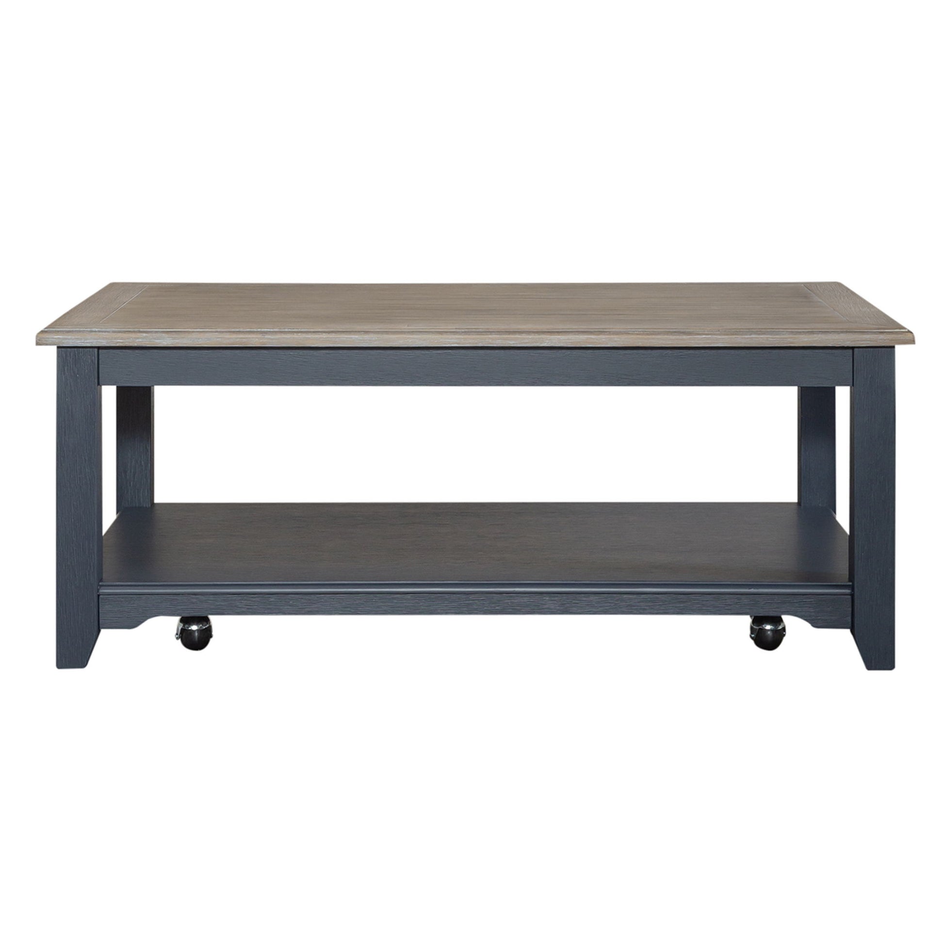 Simple but elegant is Summerville. Crafted of rubberwood solids and pine and birch veneers with a wire brushed tops, casters for easy moveability, an additional bottom shelf for storage, anchored by tapered legs. This cocktail table will beautifully complement any living room. Add the matching end table and sofa table for a complete collection.