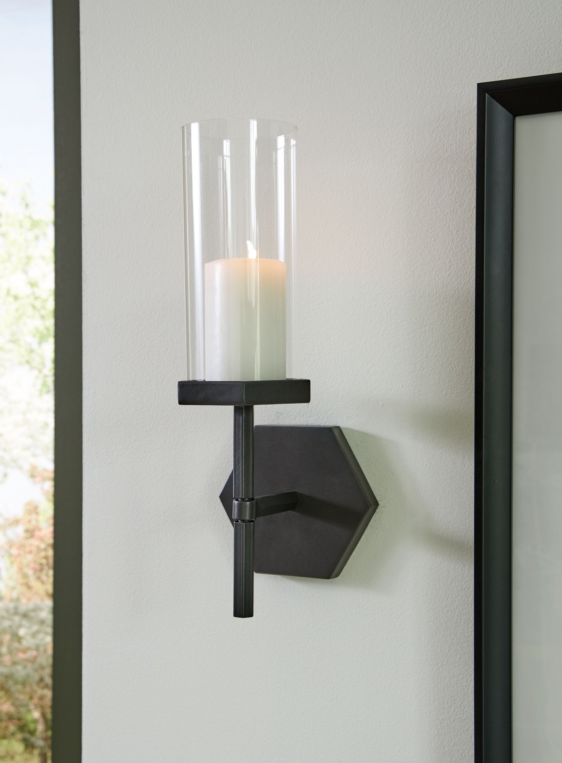 Unique and stylish, this hurricane pillar wall sconce complements all styles of interiors. With its geometric metal design and clear glass hurricane, the piece adds distinctive flair to your living space.