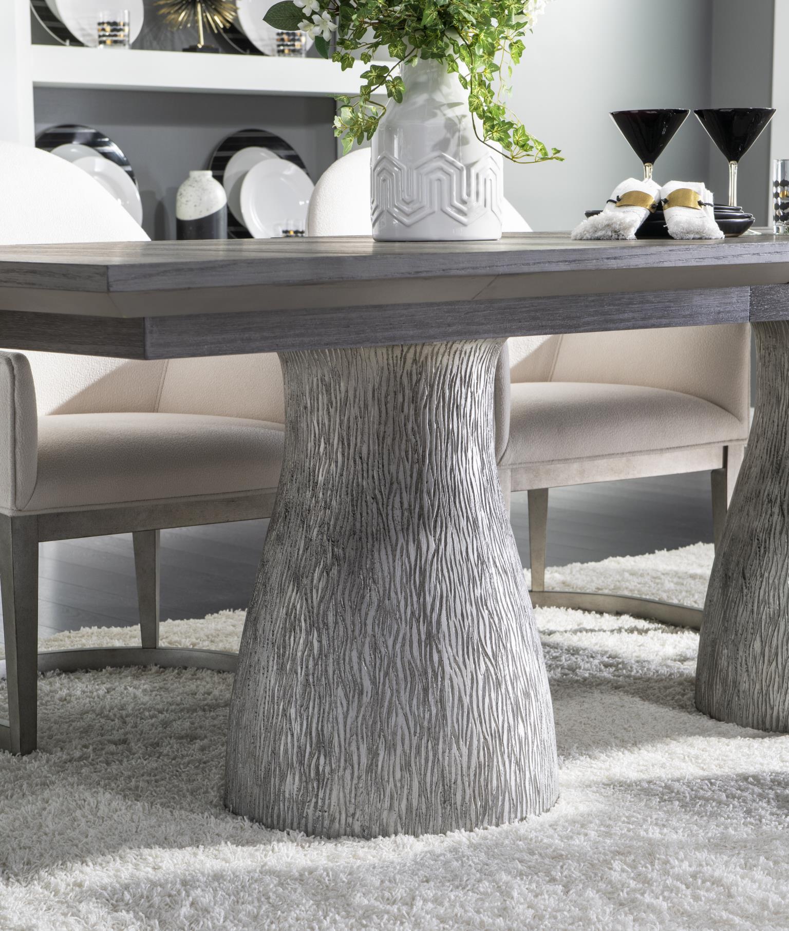 Angular modern shapes organic textures and mixed materials combine with a gray cream and metallic color palette to create a crisp modern look in the Terra Luna whole home furniture collection. The deeply wire-brushed Nightfall finish gives a tactile dimensional texture contrasting with the White Cloud case fronts and upholstery and metallic-finished table and chair bases. Over scaled jewelry-like Polished Nickel hardware adds a glam touch. The clean silhouettes paired with natural color tones and organic textures give a minimalist yet inviting appeal.