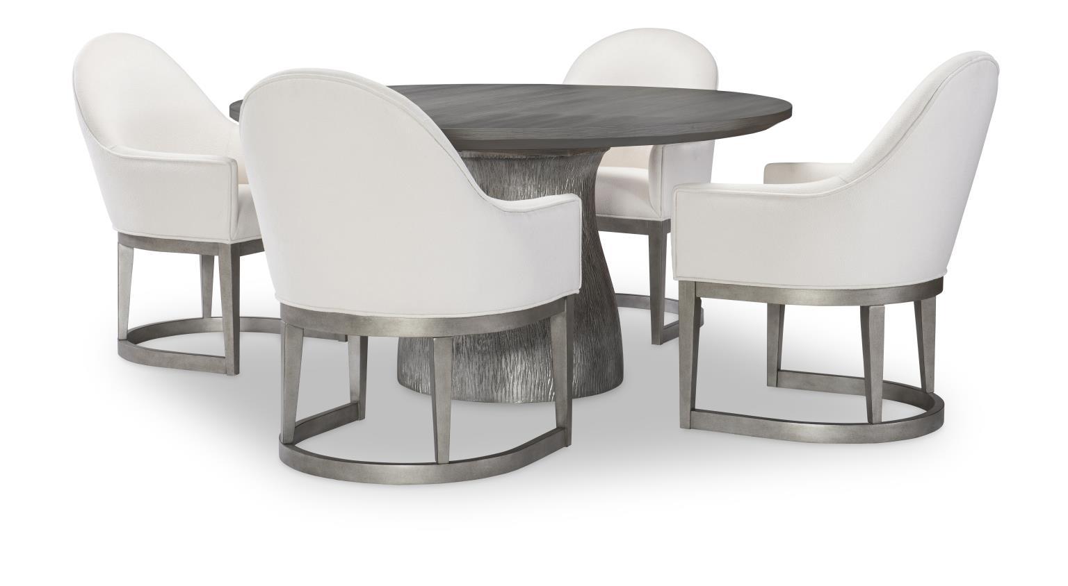 Angular modern shapes organic textures and mixed materials combine with a gray cream and metallic color palette to create a crisp modern look in the Terra Luna whole home furniture collection. The deeply wire-brushed Nightfall finish gives a tactile dimensional texture contrasting with the White Cloud case fronts and upholstery and metallic-finished table and chair bases. Over scaled jewelry-like Polished Nickel hardware adds a glam touch. The clean silhouettes paired with natural color tones and organic textures give a minimalist yet inviting appeal.