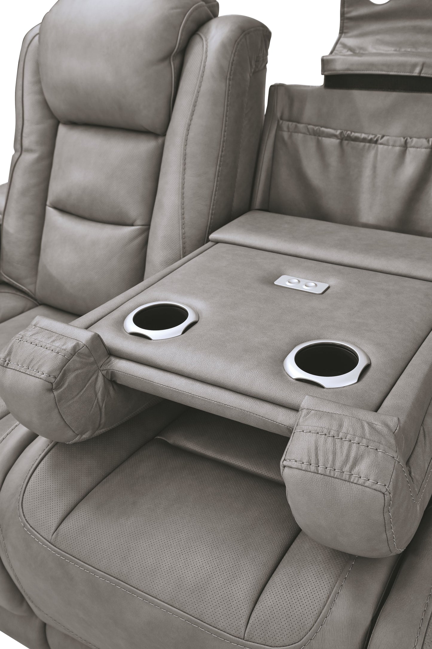 Reserved for him and made for her, this power reclining set delivers all the comfort and style you could ask for. Inspired by sports car interiors, the seating area is covered in real leather for your pleasure, with a “perforated automotive” treatment for that much more appeal. Positioned at your fingertips, the advanced one-touch power control puts you in the driver’s seat with everything from an Easy View™ power headrest and power lumbar support, to a USB port and wireless charging for your phone.