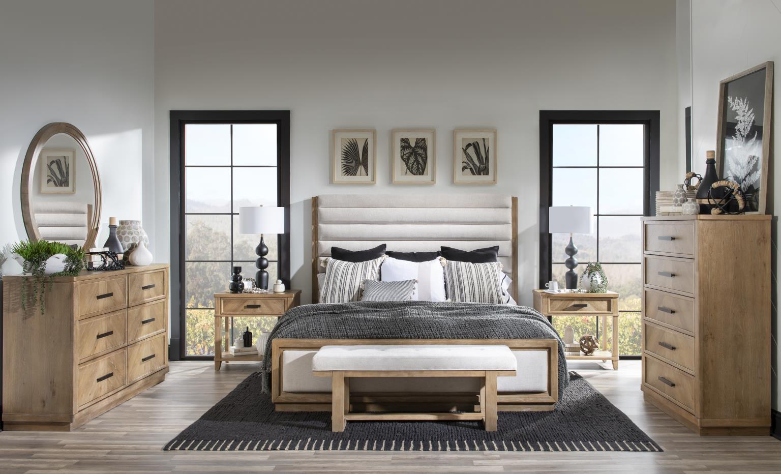 The Torrance whole home collection offers a warm and inviting contemporary casual design with an organic finish and a California coastal vibe. Crafted of random match Oak with Split Heart Cathedral Veneers in a herringbone pattern on the drawer fronts and tabletops the bedroom dining and occasional pieces have clean lines plinth bases and airy tone. Bronze hardware adds a rustic elegant touch.