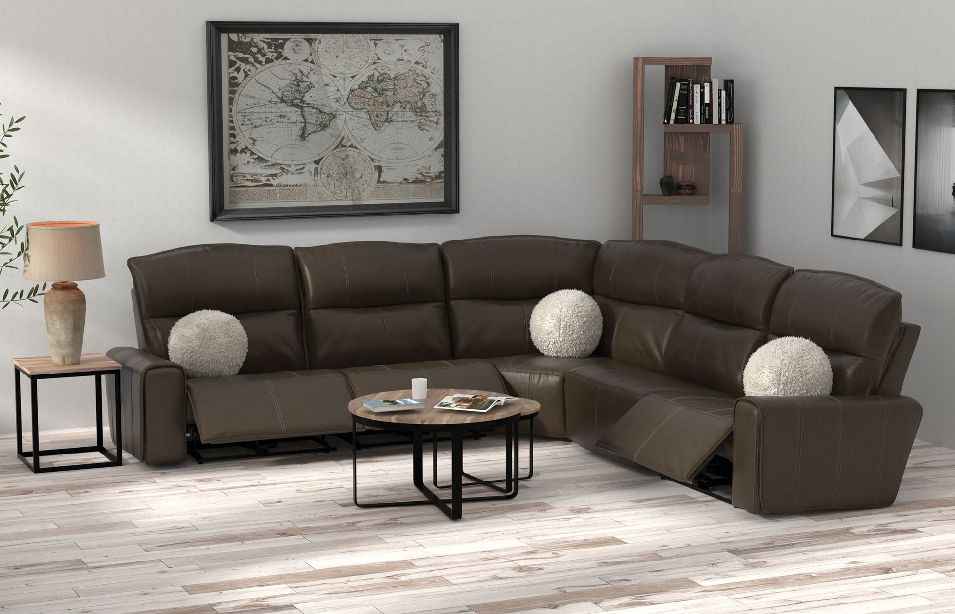Tramonti our Power Headrest and decorative sphere pillows in a luxurious faux fur for ultimate comfort. Decorative luggage stitching details adorn the genuine Italian Leather, available in one color: Chocolate.