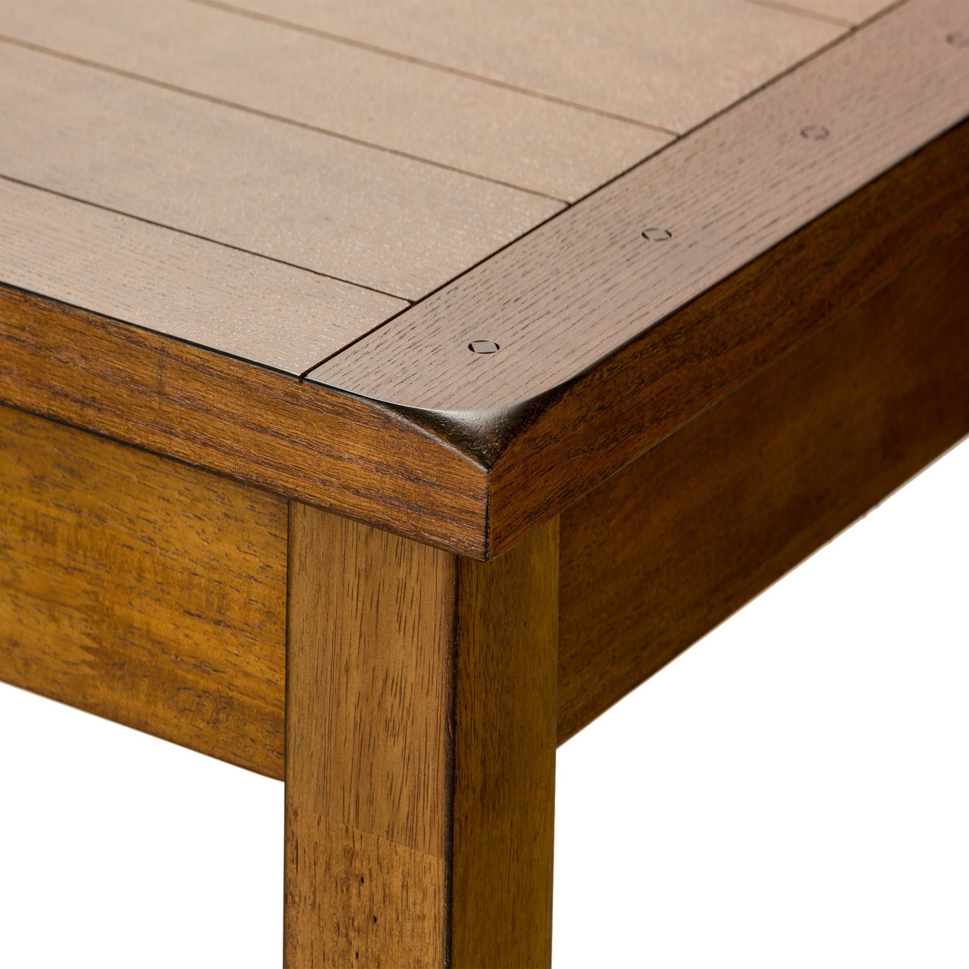 Design possibilities are endless with the Treasures five-piece rectangular table set. Crafted of rubberwood solids and oak veneers, this set features a finish and includes the leg table and sheaf back side chairs. The table has a fixed planked top with wood peg accents and tapered legs. The chairs have saddle shaped seats for added comfort and an H shaped stretcher for extra support as well as nylon chair glides to protect your flooring. Treasures offers simple shaker styled dining in a subtle finish which evokes the feel of a treasured antique.