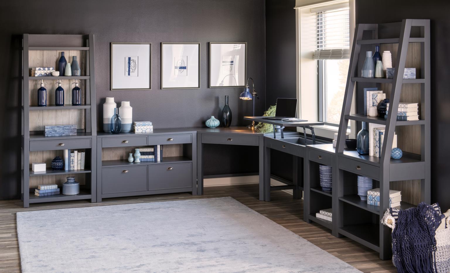 Style merges with functionality to create this modern modular home office collection. Each item is designed to stand alone or can be combined with other pieces for a customized home office. The desk options provide workspace while the bookcase and drawer cases give you plenty of area for display and storage.