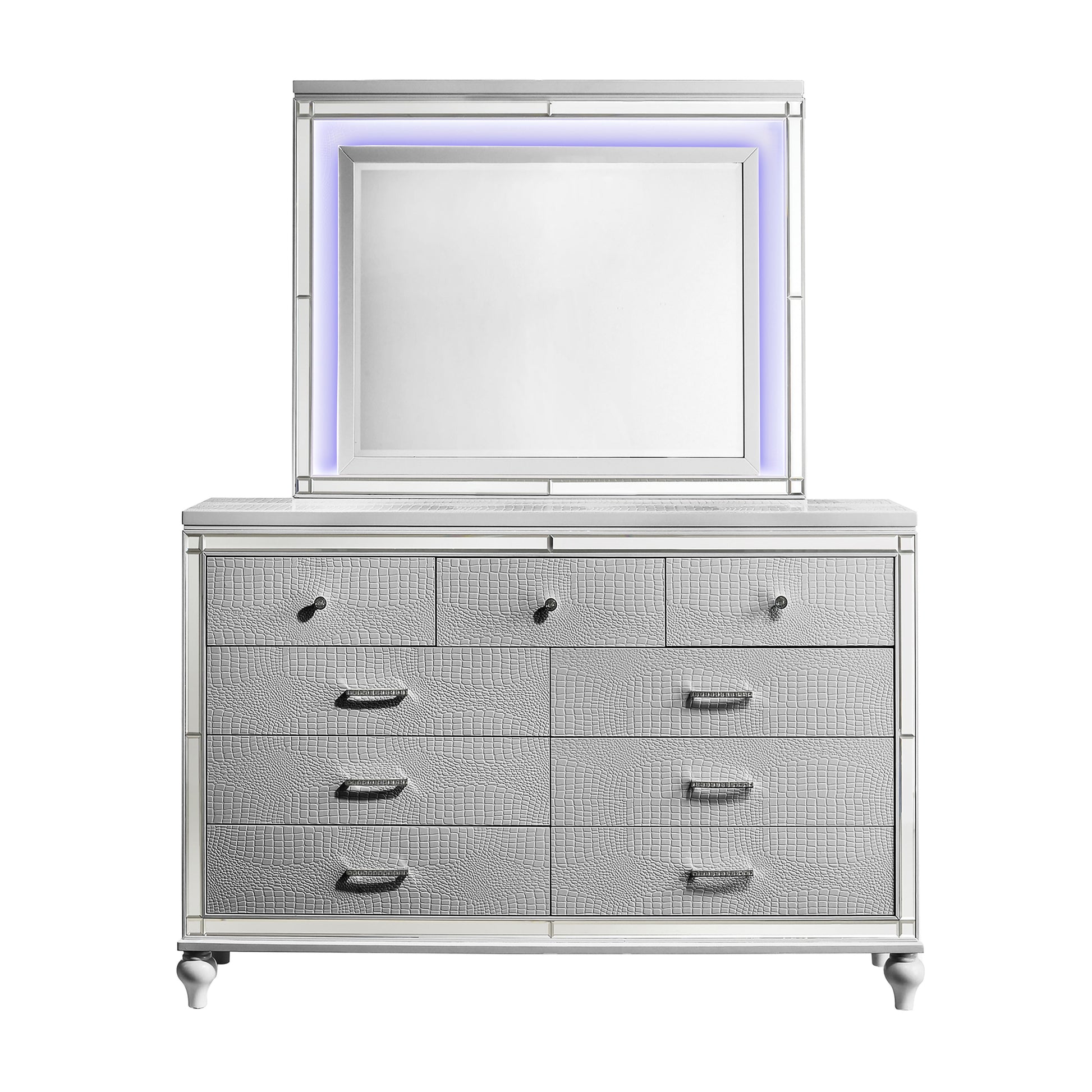 The Valentino 2 Piece Dresser with Lighted Mirror is a stunning piece of furniture that combines durability with glamorous details. Crafted with a blend of manufactured and solid woods, it boasts decorative embossed inlays that add to its distinctive charm and longevity. Its glitzy appearance is accentuated by a gleaming black finish, mirrored trims, crystal-studded drawer pulls, and alligator-embossed inlays, reminiscent of Hollywood glamour. One of its standout features is the soft LED lighting integrated into the dresser mirror, creating an ambient atmosphere perfect for setting the mood. Functionality is not compromised, as the dresser offers an abundance of storage with its nine drawers, ensuring ample space for all your clothing and belongings. With its combination of style and practicality, the Valentino 2 Piece Dresser with Lighted Mirror is sure to elevate the aesthetic of any bedroom.
