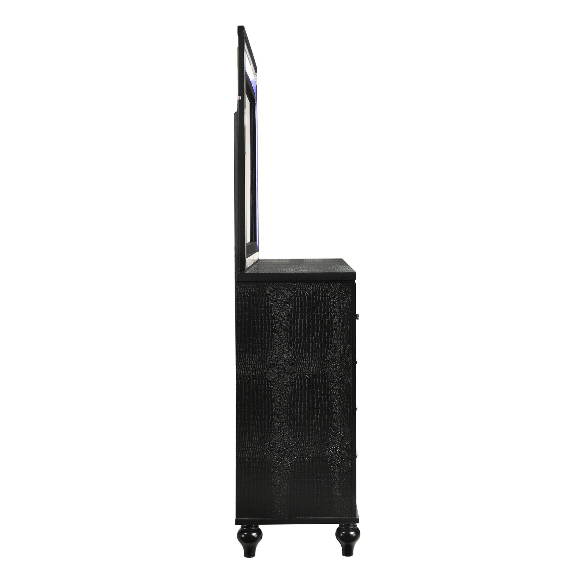 Featuring a lighted and upholstered headboard, the Valentino collection is brimming with features. Embossed inlays, mirrored borders, and turned feet all add to the unique styling of this suite.