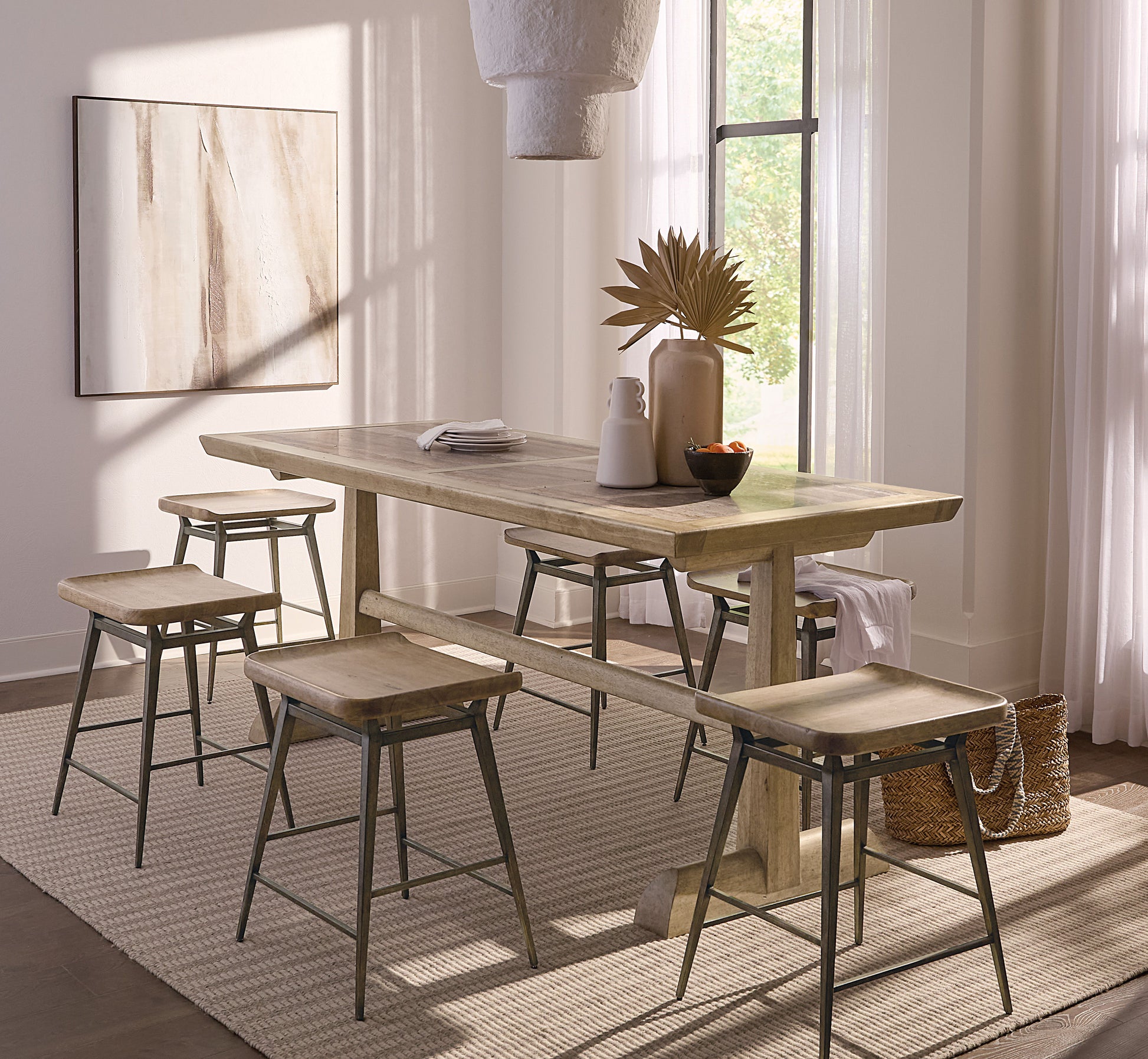 Capture the essence of a wine-and-cheese soiree at a Napa Valley winery with the Vineyard Row Friendship Table. Featuring a honed Travertine Stone inset top, the counter-height table is crafted of Pecky Hickory veneers with the light-and-airy Sonoma finish. The stone top combines gray, beige, cream and brown tones.