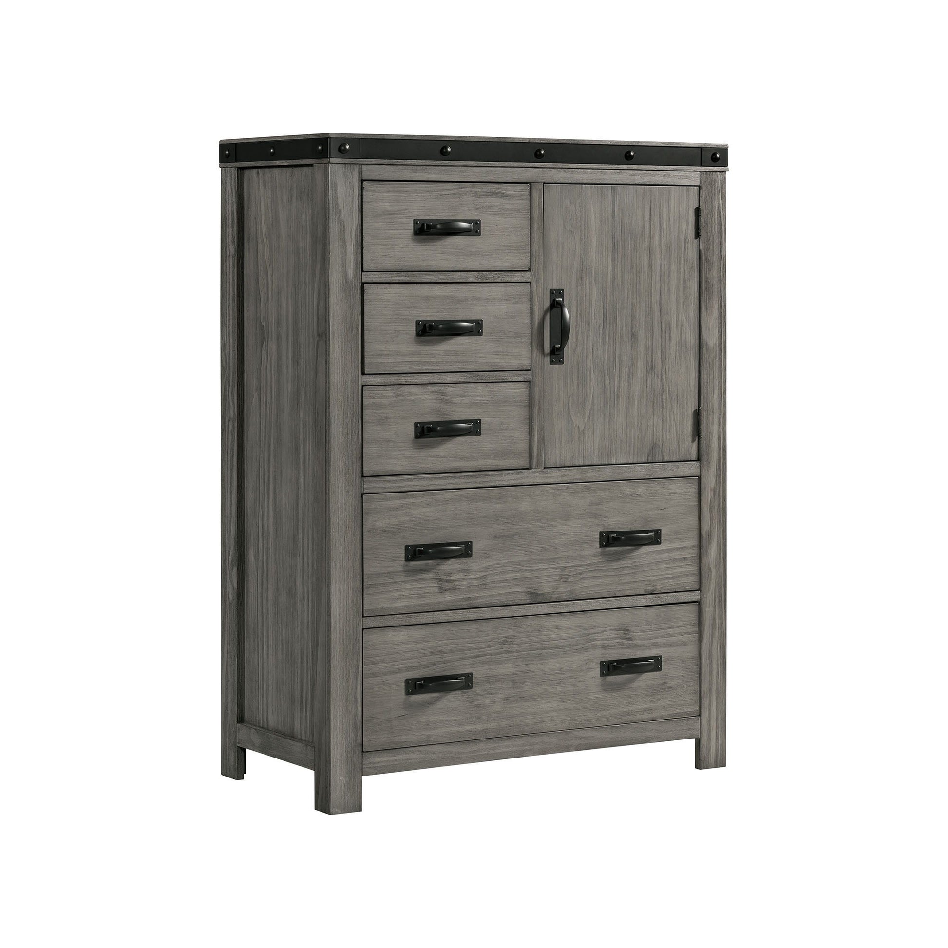 The Wade 5-Drawer Gentlemans Chest is the ultimate chest for your bedroom! This chest comes with five, spacious drawers; perfect for easily keeping all of your belongings neatly stored away. This piece also comes with a cabinet with interior shelves for extra storage space. The bottom drawer features a dust proofing layer to help protect your belongings. The drawer pulls and trim along the top of the chest are both metal with a black finish. Along the trim on the chest are decorative bolts, adding a little extra flair. Please note wood grains vary piece by piece and will not look exactly like the picture.
