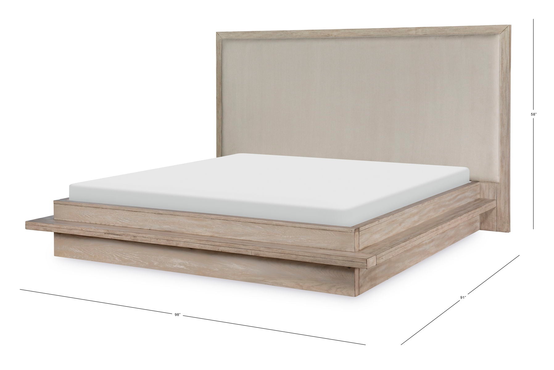 This complete upholstered bed embodies refined rustic and modern elements. Minimalist design details such as block feet and clean lines lend the perfect backdrop for the distinctive wire brushed finish. A fabric pops against the earthy weathered oak finish and will blend with any bedroom color palette and décor.