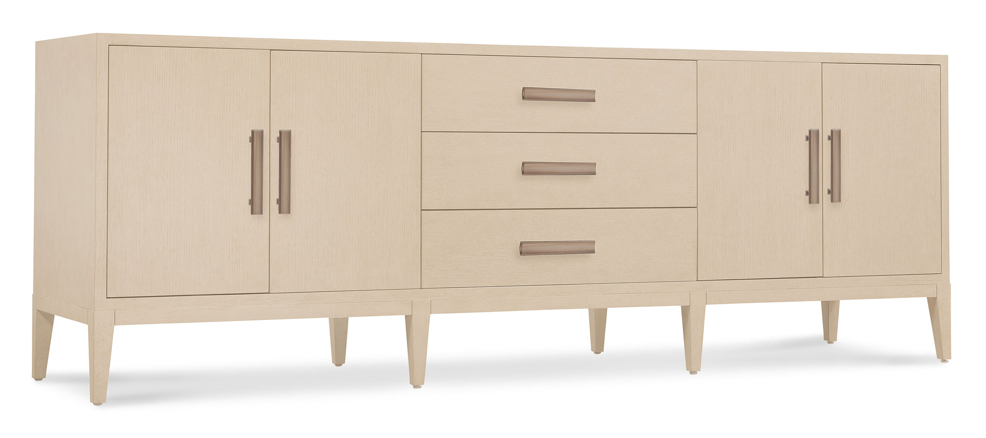 The Westwood Credenza combines sleek modern design with subtle sophistication, making it perfect for living rooms or entertainment spaces. Finished in Polished Limestone over quartered oak veneers, it exudes a soft modern appeal. Featuring four doors with one adjustable shelf behind each pair, three center drawers, and a ventilated back panel with wire management cutouts, this credenza is ideal for holding entertainment systems or providing extra storage. The custom plated Radiance finish hardware and tapered legs complete the look of this elegant yet functional piece.