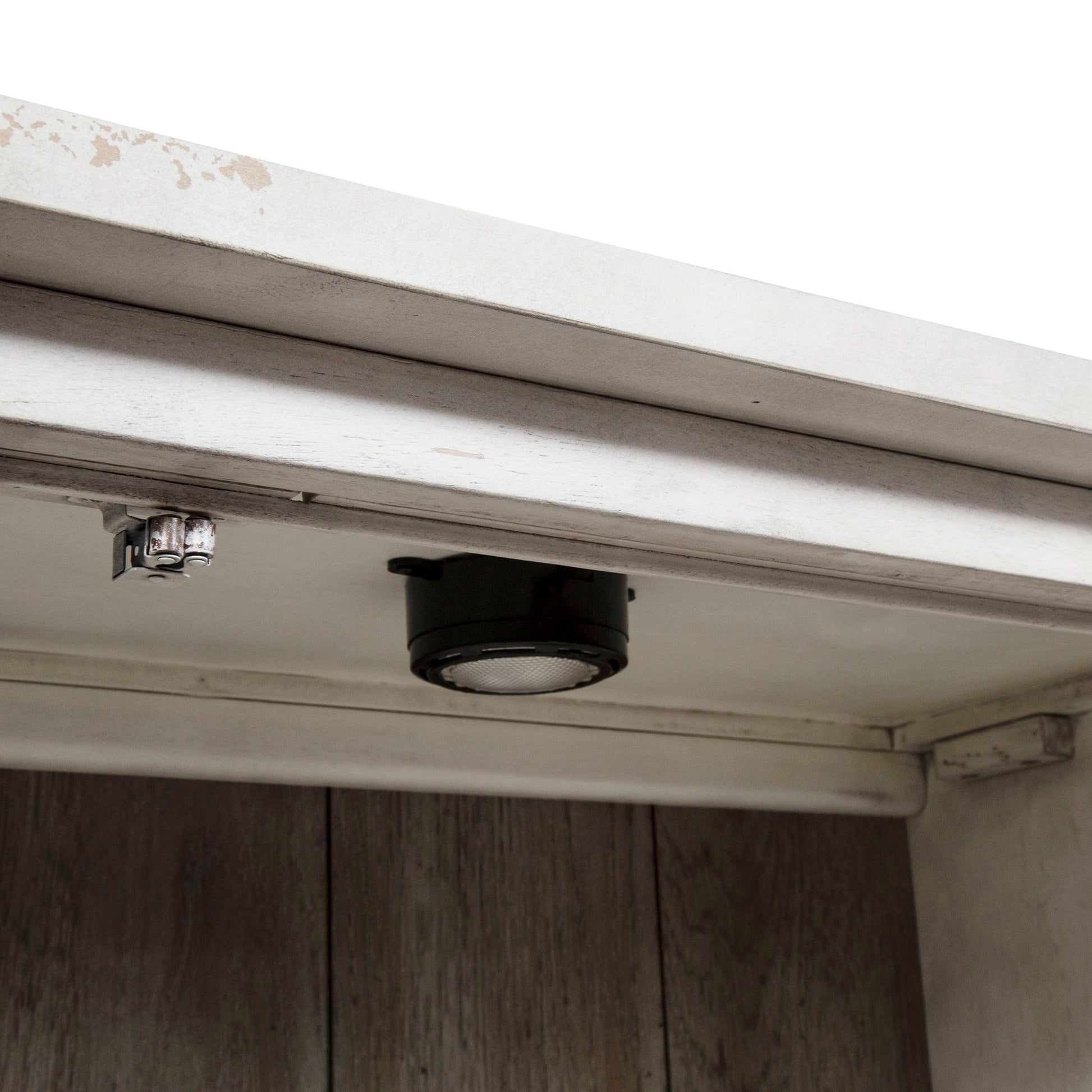 Invite an English country charm into your home with the Whitney display cabinet. Crafted of rubberwood solids with oak veneers, this piece features wooden drawer glides, felt lined top and center drawers to protect contents, a gallery top, planked back panel in a weathered grey finish, two wood framed glass shelves behind the two wood framed glass doors, touch lighting to illuminate the display, five bottom storage drawers, turned bun feet, and is accented by wooden knob hardware with metal inserts. The antique linen and weathered gray finish gives this group an heirloom appeal.
