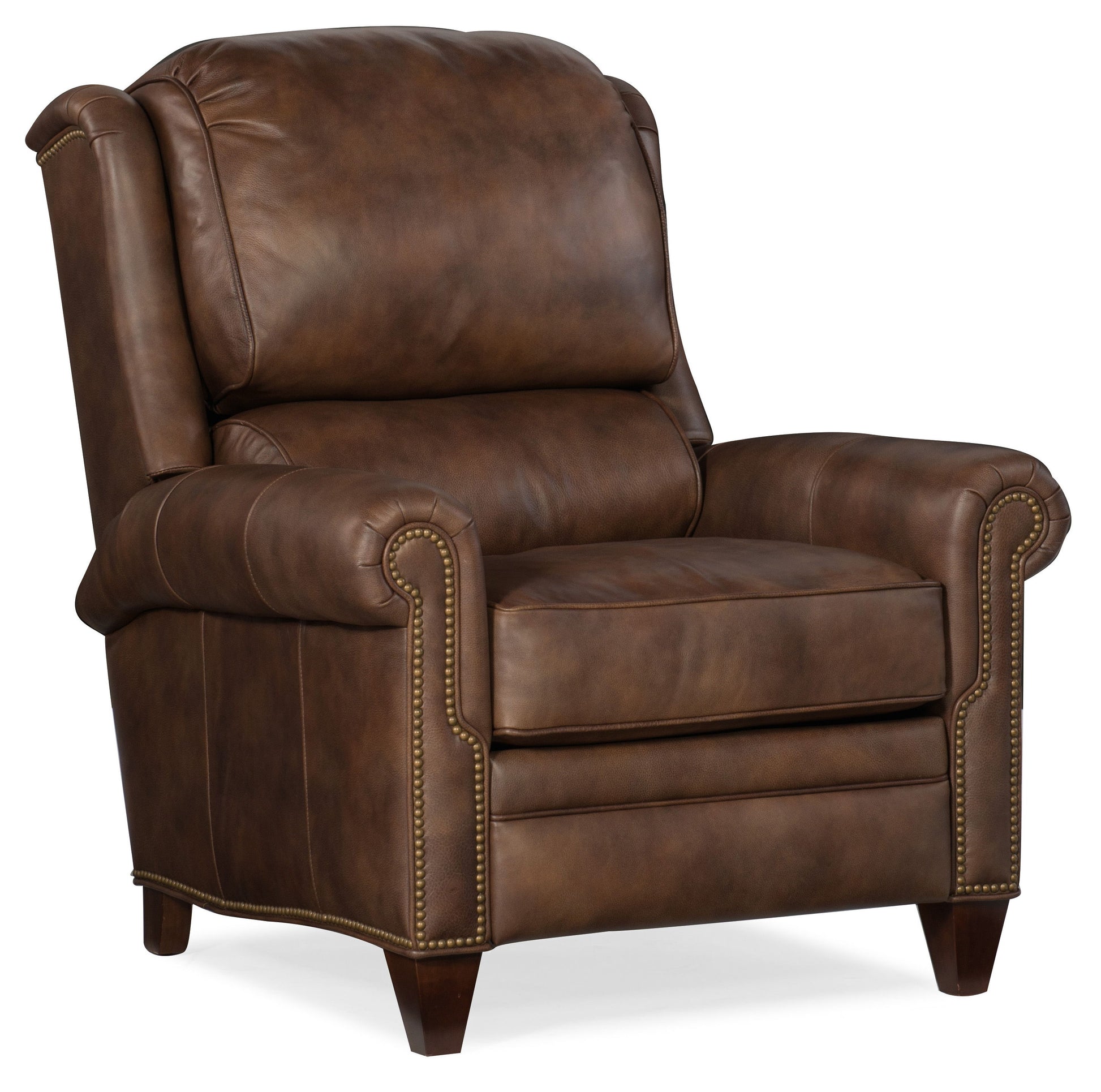 The William Recliner features traditional styling with a spring down cushion and bustle back cushion. The mahogany finish and #9 natural nailheads come standard, however, other finishes and nailhead are available. Pushback recline is standard with an optional power button available for an upcharge.
