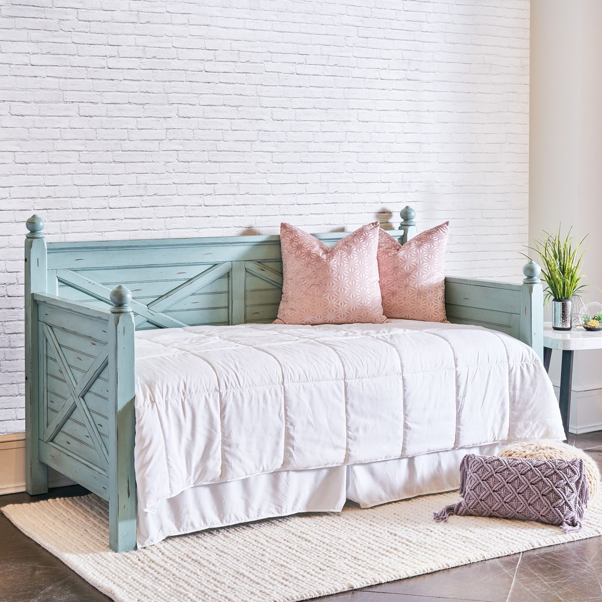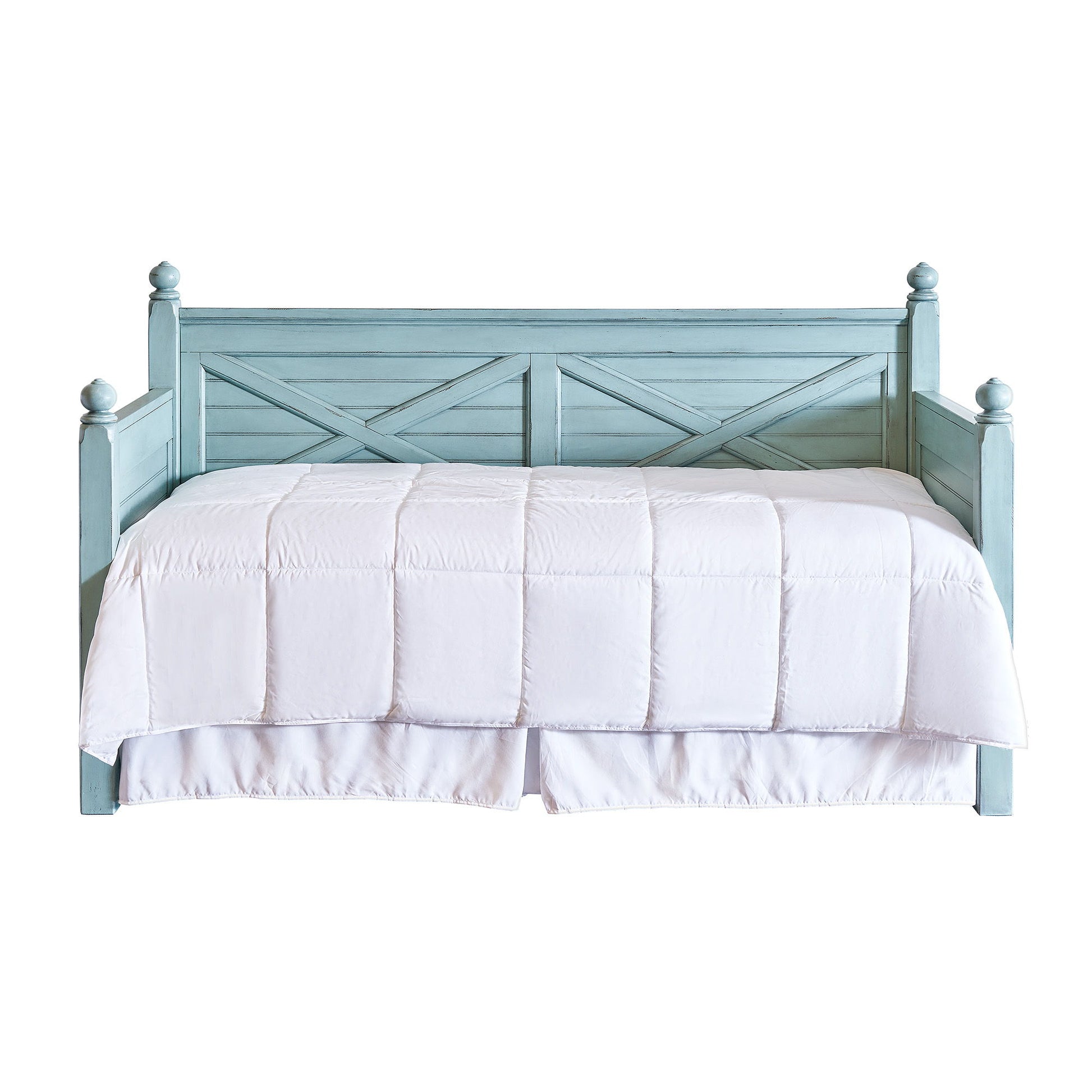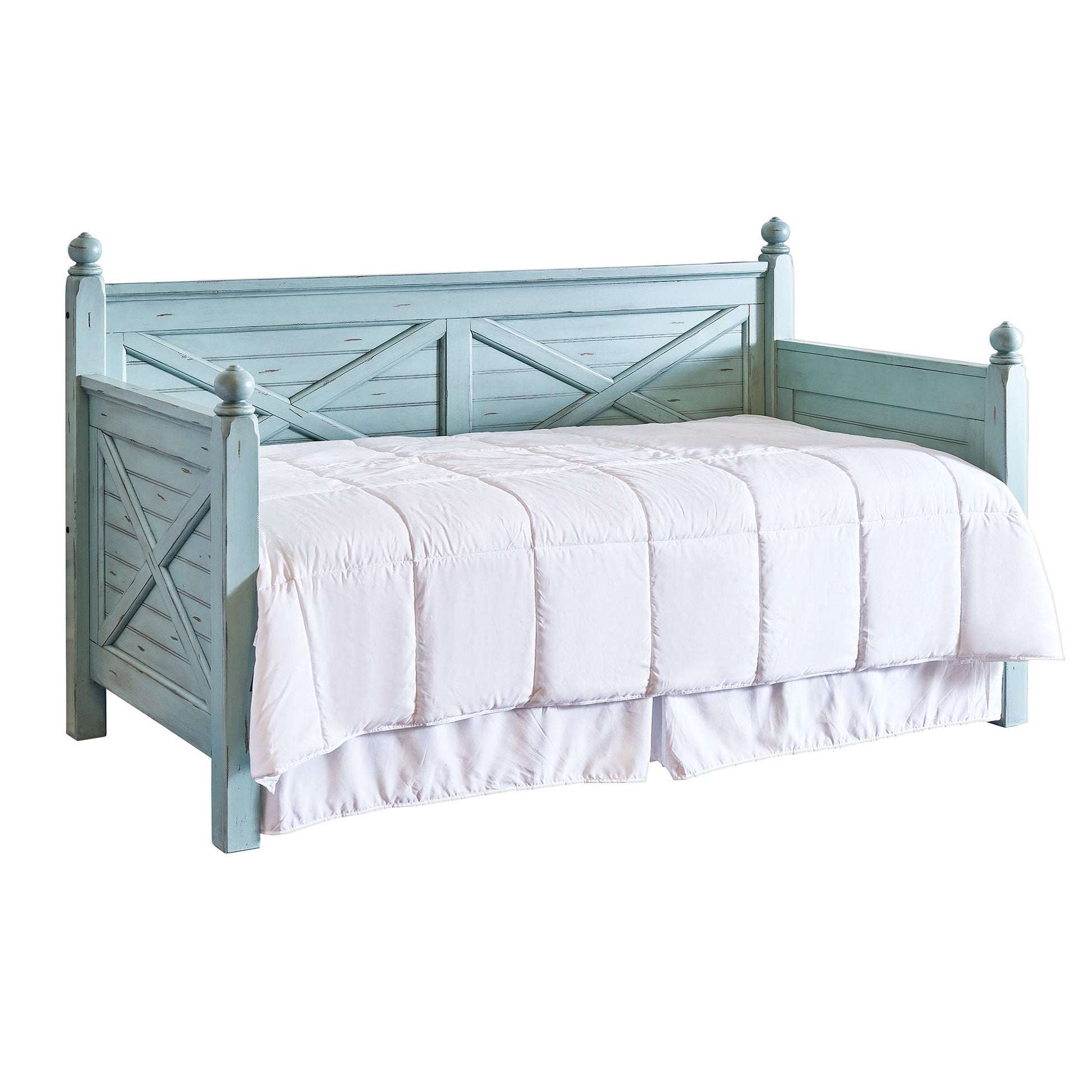 The Woodhaven Twin Daybed is going to look gorgeous in your home! Daybeds are no longer reserved for bedrooms, make a cozy reading area using the daybed for a fresh take. The X-Designs along the sides and the back, give this daybed some extra flair! This piece will of course look as equally stylish in a guest bedroom thanks to its cool, light blue finish. The finish will pair beautifully with any existing decor you might have and the distressed markings that are visible throughout, take this piece to the next level!