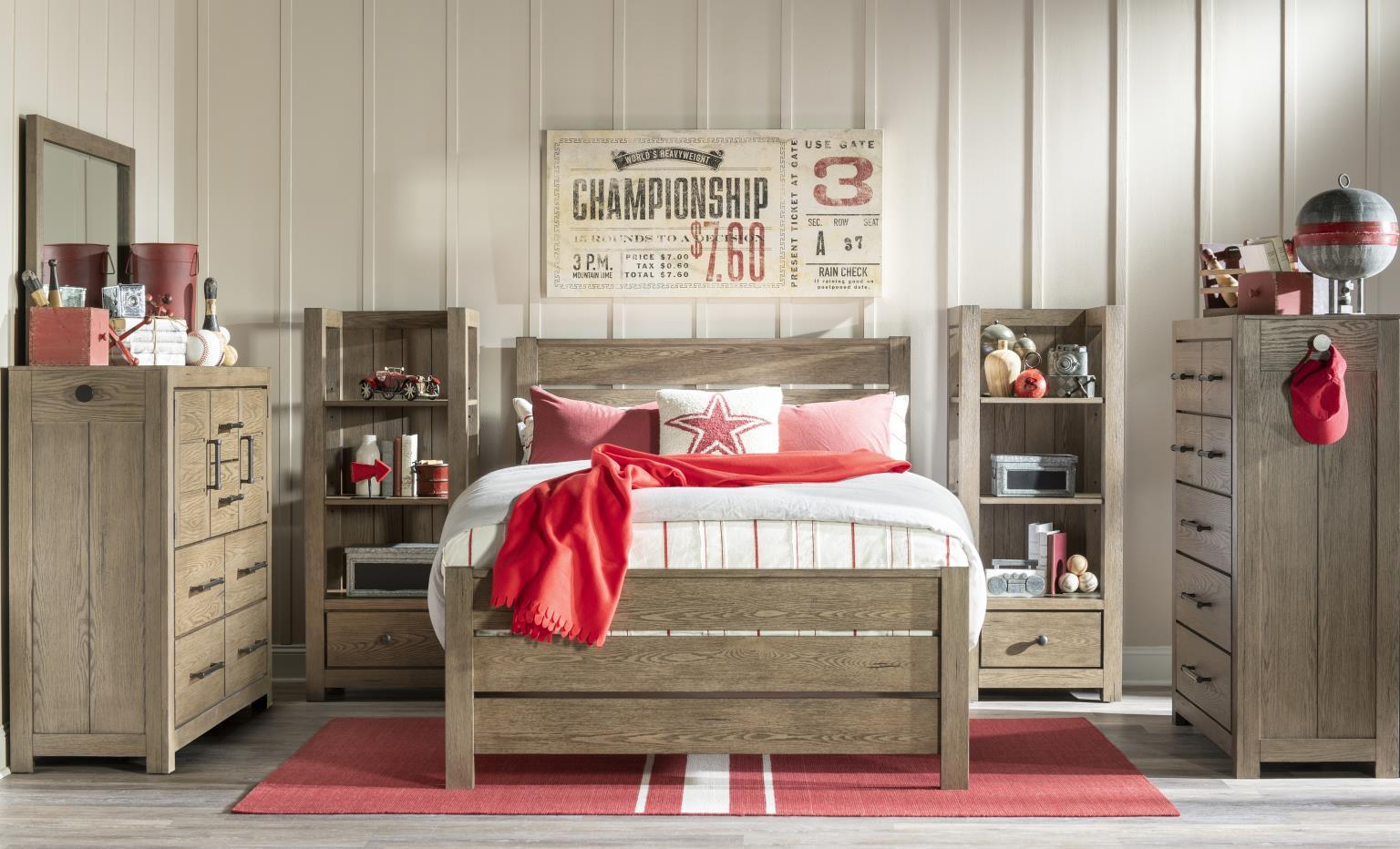 The Wyatt collection combines rustic charm with modern functionality. The weathered stone finish exudes warmth and character. Rustic Pewter bar pulls complete the look. Choose between the slat panel bed or captain's bed complete with spacious drawers and slide-out workspaces for homework or creative projects. The convenient trundle option is perfect for sleepovers or additional underbed storage. The elevated desk features ample drawer and door storage plus a light to brighten any task. Power outlets and USB charging ports on select pieces allow you to easily plug in lamps and charge electronics.