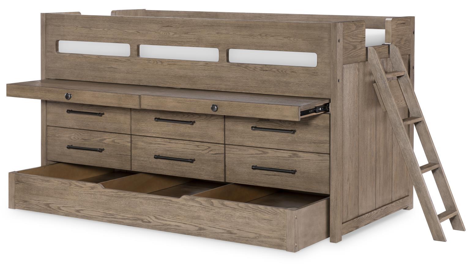 The Wyatt collection combines rustic charm with modern functionality. The weathered stone finish exudes warmth and character. Rustic Pewter bar pulls complete the look. Choose between the slat panel bed or captain's bed complete with spacious drawers and slide-out workspaces for homework or creative projects. The convenient trundle option is perfect for sleepovers or additional underbed storage. The elevated desk features ample drawer and door storage plus a light to brighten any task. Power outlets and USB charging ports on select pieces allow you to easily plug in lamps and charge electronics.
