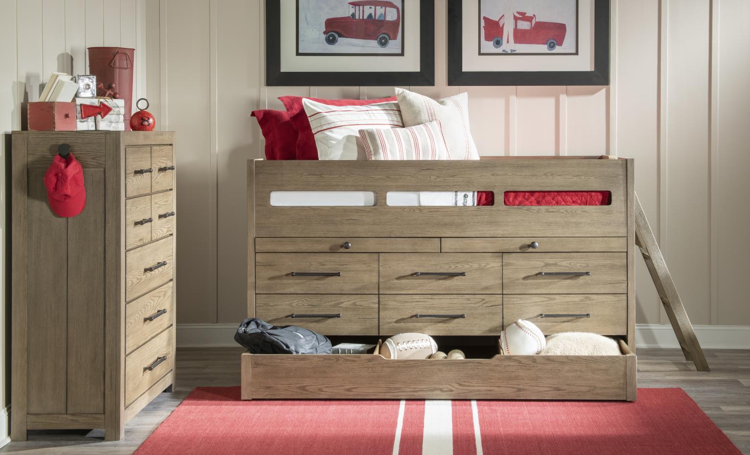 The Wyatt collection combines rustic charm with modern functionality. The weathered stone finish exudes warmth and character. Rustic Pewter bar pulls complete the look. Choose between the slat panel bed or captain's bed complete with spacious drawers and slide-out workspaces for homework or creative projects. The convenient trundle option is perfect for sleepovers or additional underbed storage. The elevated desk features ample drawer and door storage plus a light to brighten any task. Power outlets and USB charging ports on select pieces allow you to easily plug in lamps and charge electronics.